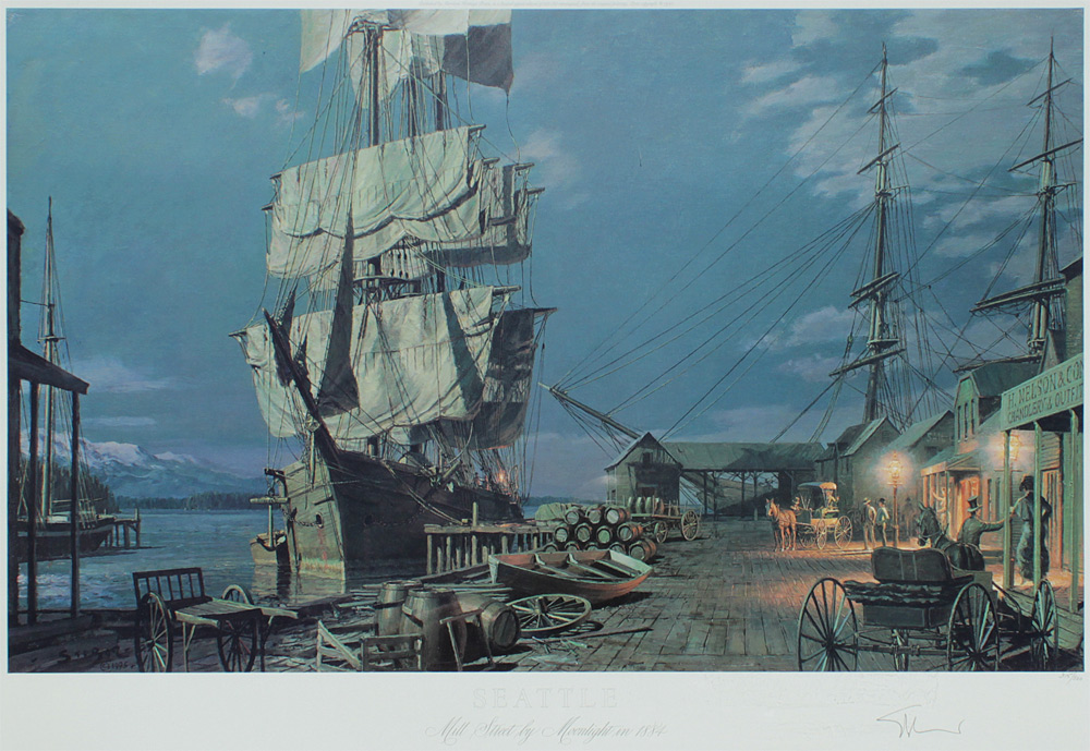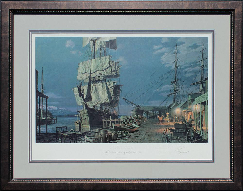 STOBART, John, (American, 1929-): ''Seattle, Mill Street by Moonlight'', Lithograph, sight size 19'' x 27 1/2'', pencil signed lower right and numbered 315/500, custom frame and matting, 28 1/2'' x 37 1/2''.
