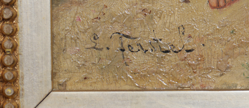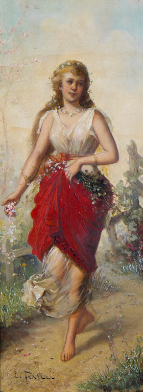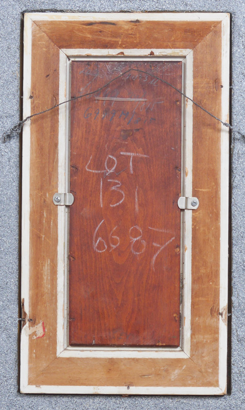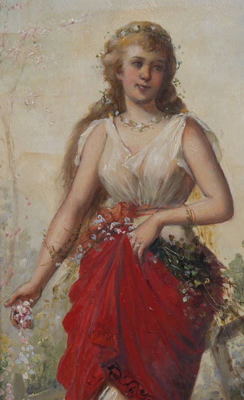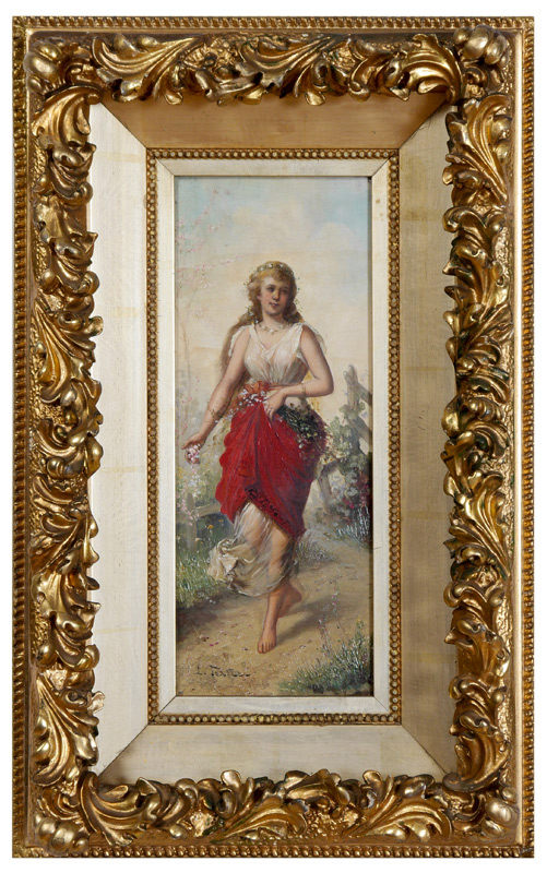 ILLEGIBLY SIGNED PAINTING OF A YOUNG BEAUTY: Oil/Wood, 11 3/4'' x 4 1/2'', signed lower left L. Ferstel?, gilded floral motif deep dish gesso molding, 19'' x 12'' x 3''.