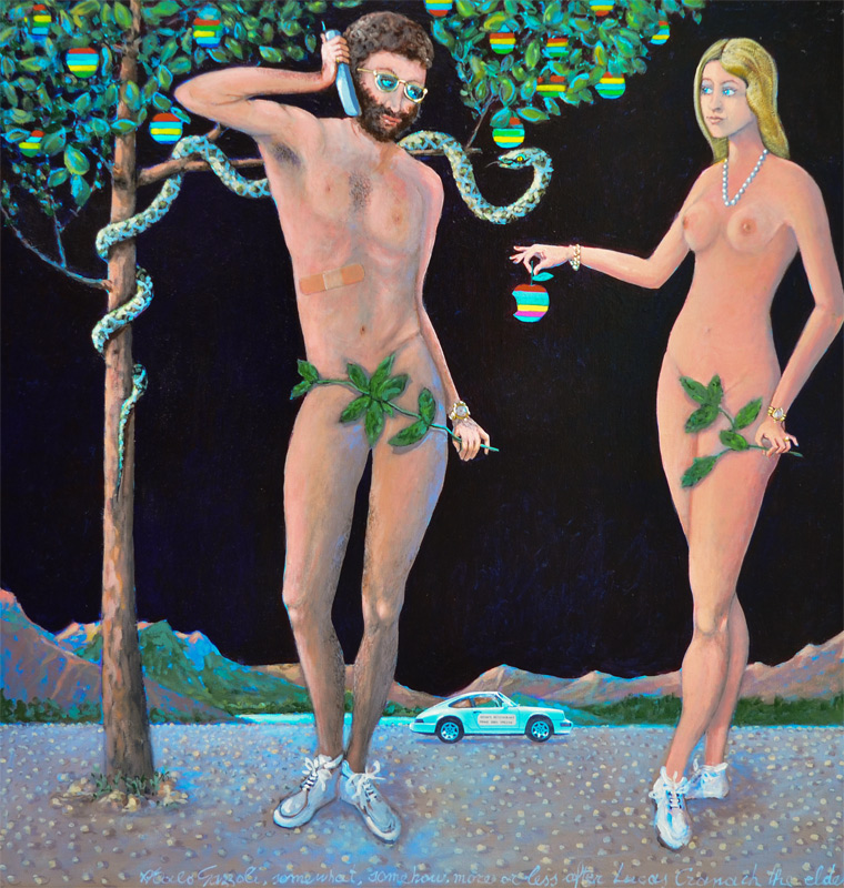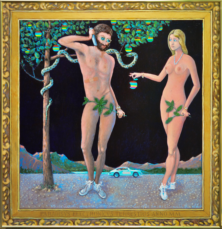 GAZZOLI, Italo, (American, 20th C.): Adam & Eve, Acrylic/Canvas, 35'' x 35'', signed, notations in the bottom margin ''Paradisus Electronicus Terrestris Anno MM'', ''Somewhat, somehow, more or less after Lucas Cranach the Elder''. Note the applied bandaid to Adam's rib, the Porsche in the background with sign on the side that reads, ''Adam's Restaraunt, Prime Ribe Special'', Eve is holding an apple with a bite out of it, in the style of the Apple logo, all the while Adam is on his cell phone, framed, 36'' x 36''.