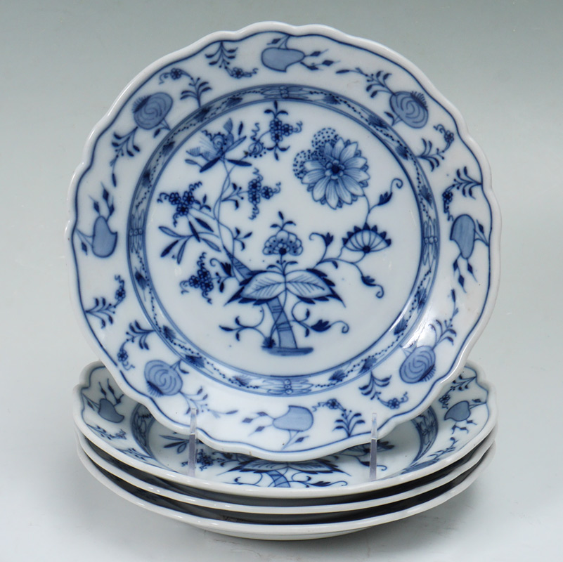 4 MEISSEN BLUE ONION PLATES: Scalloped edge with Meissen circle mark, 9'' dia.