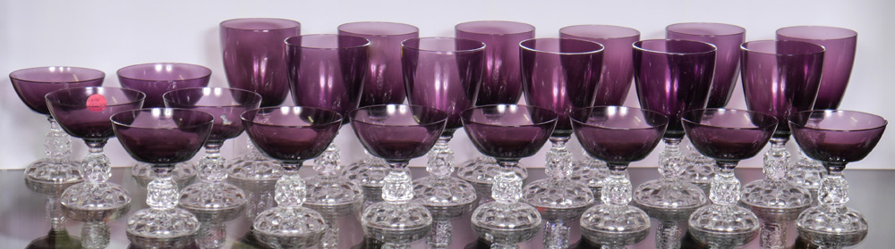 FOSTORIA AMERICAN LADY GLASSWARE: Amethyst on cleat stem. 22 piece to include 11 water goblets (6 1/8''), and 11 champagne sherbet (4 1/8'').