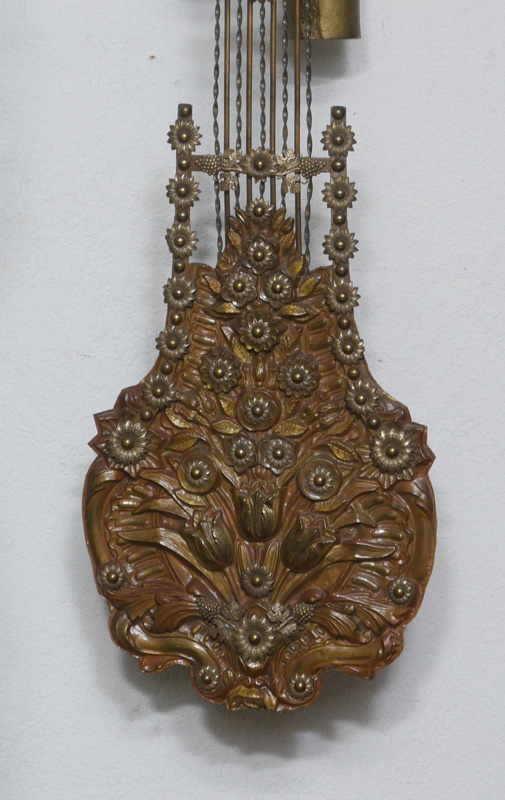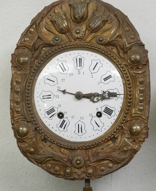 FRENCH MORBIER WAG ON THE WALL CLOCK: Embossed floral motif brass frame, unmarked porcelain dial with Roman numerals and date ring, overall measures 17 1/4'' h. x 12 3/4'' x 7 1/4''. European time and strike movement, embossed brass pendulum measures 43 1/2'' h. x 12'' x 1''.