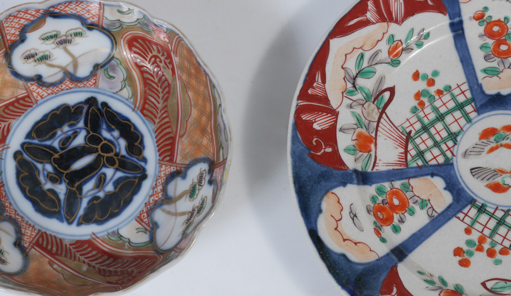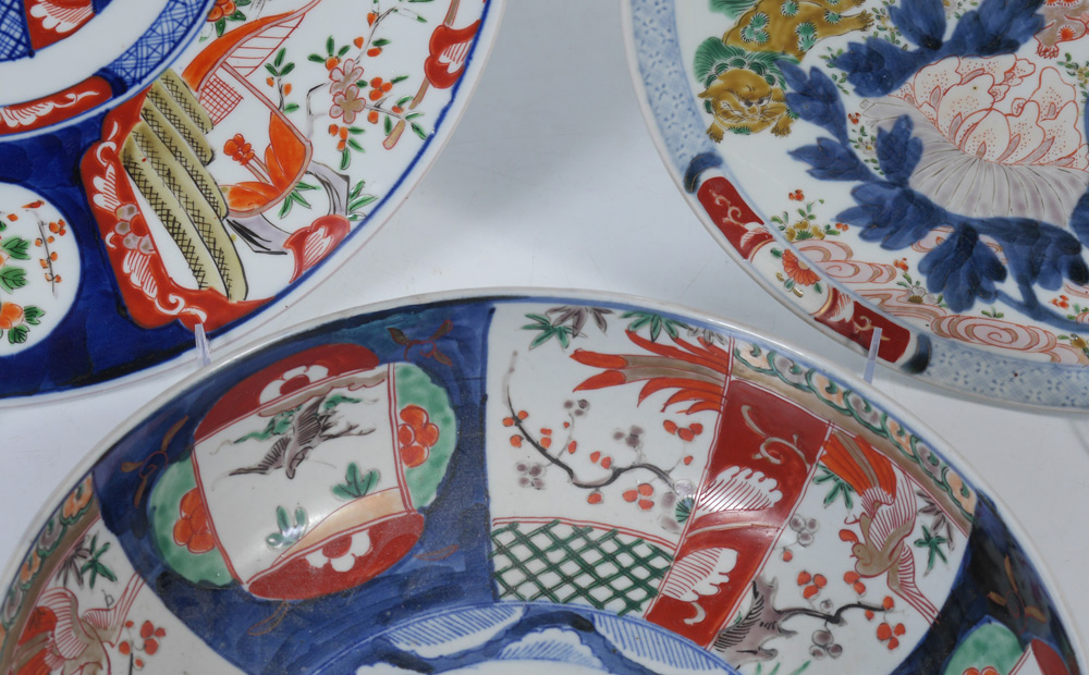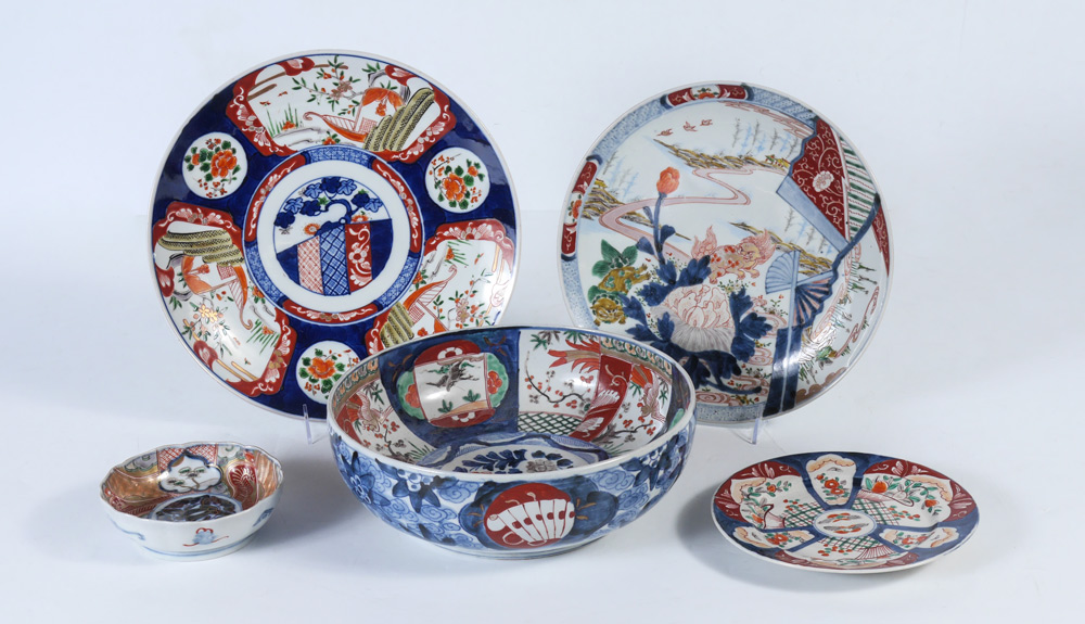 ESTATE IMARI PORCELAIN: 5 piece group to include the 13 3/8'' charger, the 12 1/4'' dia. charger, the large 12'' dia. bowl, a 8 1/2'' plate and the 6'' dia. bowl.