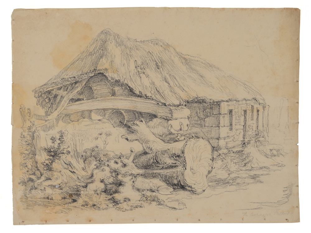 DRAWING ATTRIBUTED TO J.M.W. TURNER FROM THE ESTATE OF JOHN ANDERSON JR. OF ANDERSON GALLERIES IN NEW YORK: ''The Cooperage'', Pencil sketch, 9 1/4'' x 13 1/4'', watermarked Waterman Turkey Mill, 1811, a paper for which Turner was known to use. Mr. Anderson is the author of ''The Unknown Turners'', Scribner Press, 1926, New York, New York. All artworks are from his personal art collection originally sold in Litchfield Connecticut.