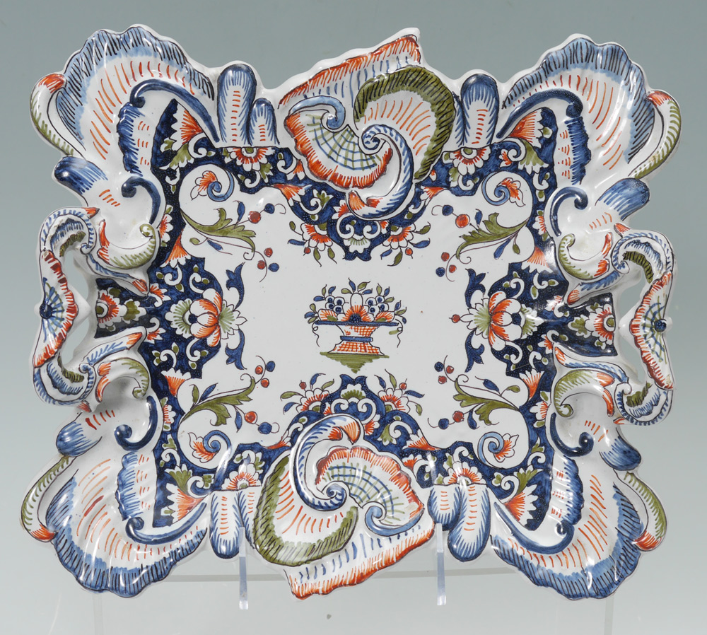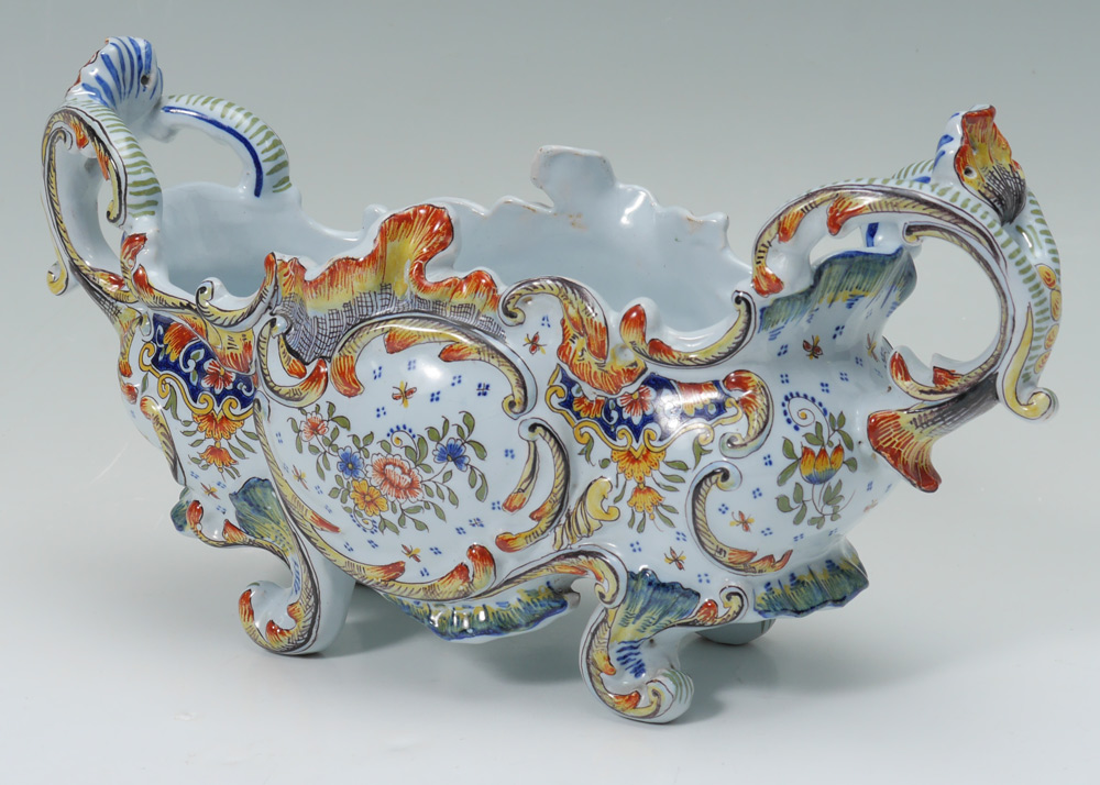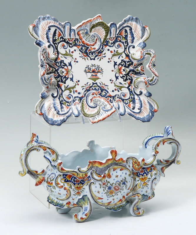 FRENCH FAIENCE CENTER BOWL & TRAY: 2 pieces total to include 1) Floral decorated center bowl with heraldic shield and motto ''A-Ma-Vie''. Marked on base and dated 1948. 8'' h. x 15 1/2'' x 6''. 2) Double handled tray with floral decoration, marked C on base. 2 3/4'' h. x 12 1/4'' x 10 3/4''.