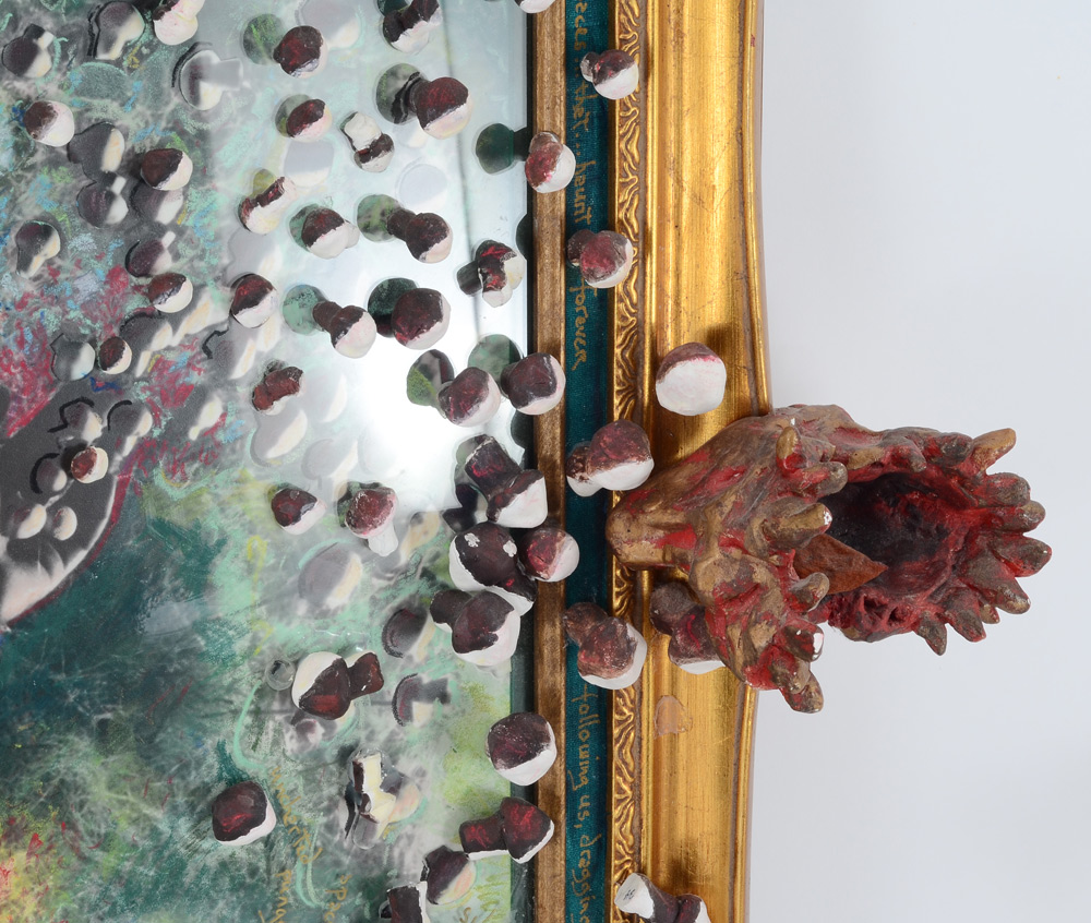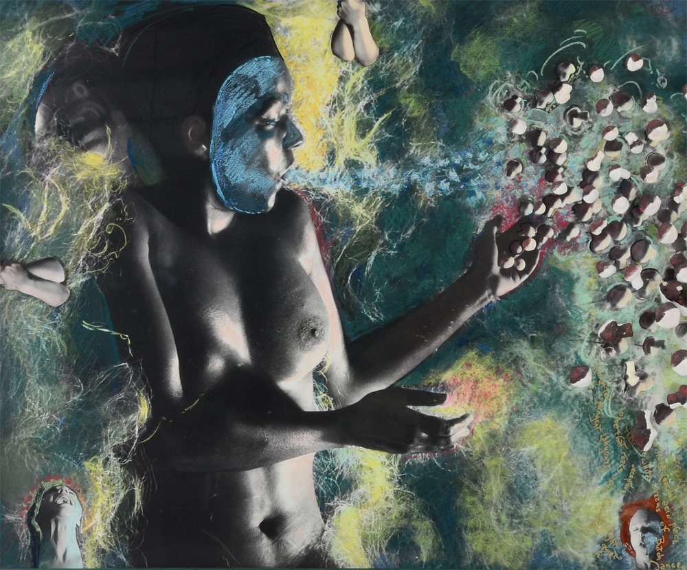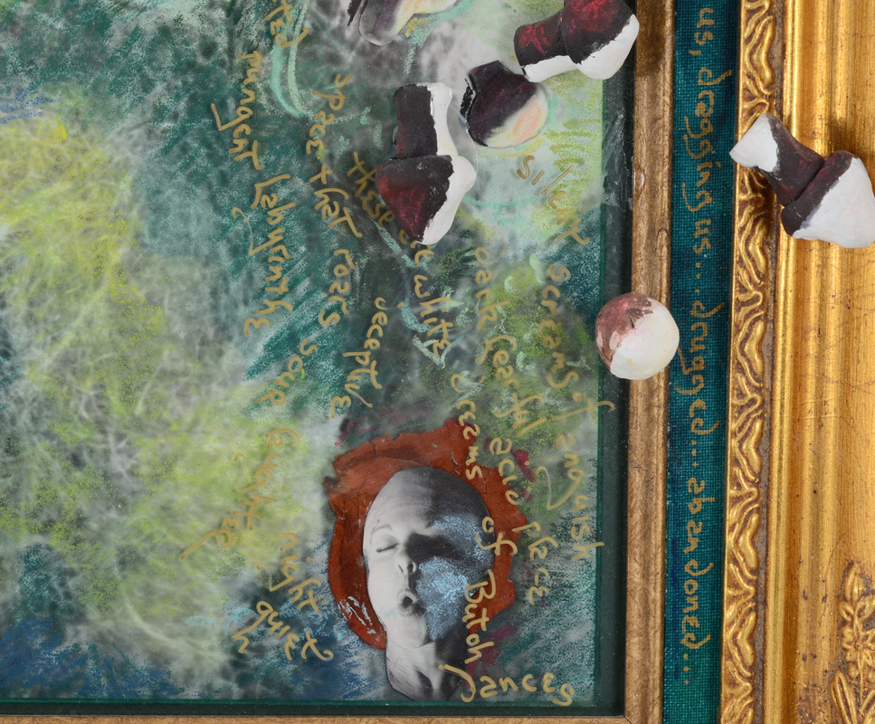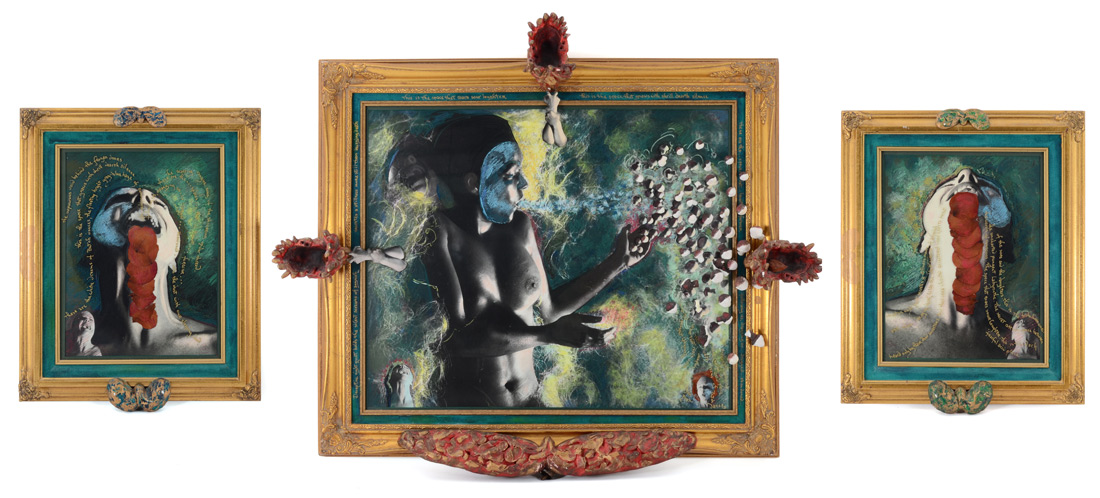 LABOBGAH, Bob, (American, 20th C.): 3 pc framed mixed media artwork lot to include; 1) Surreal Nude Composition, overall measurements with custom frame, 30'' x 35'' x 4'', signed upper right; 2 & 3) Screaming Faces, overall measurements with custom frames, 18'' x 16'', both signed lower right.