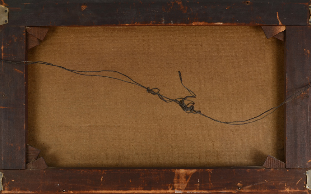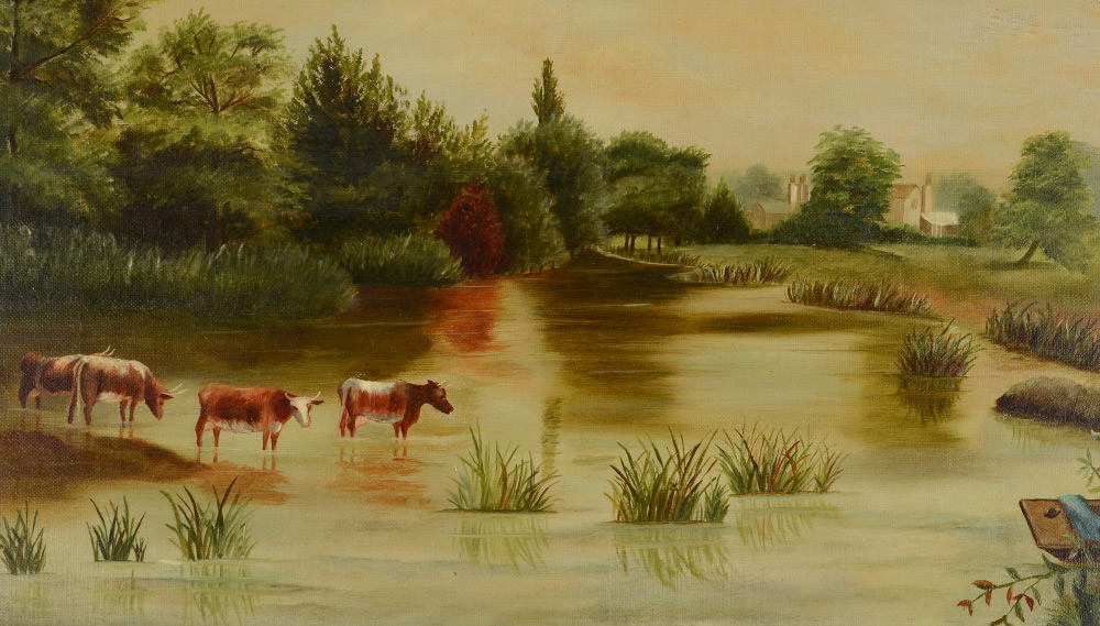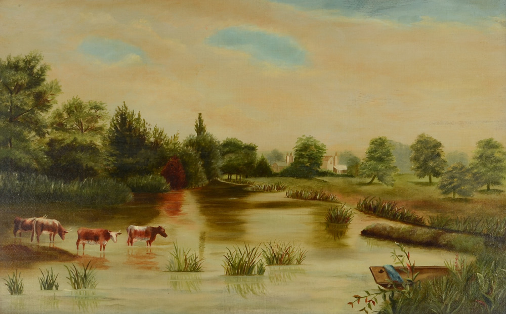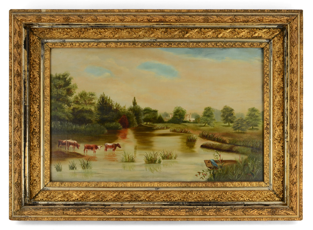 NAIVE 19TH C. LANDSCAPE PAINTING WITH COWS: Oil/Canvas, 14'' x 22'', gesso molding, 21 1/2'' x 29''.