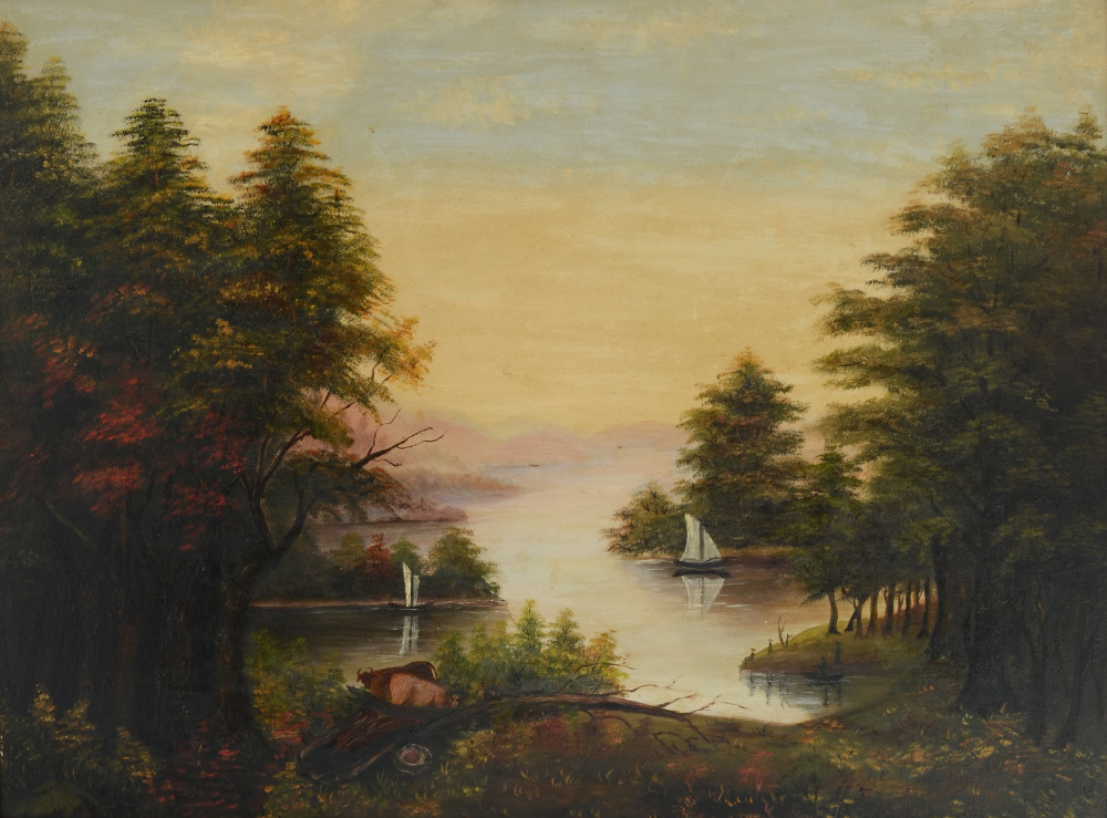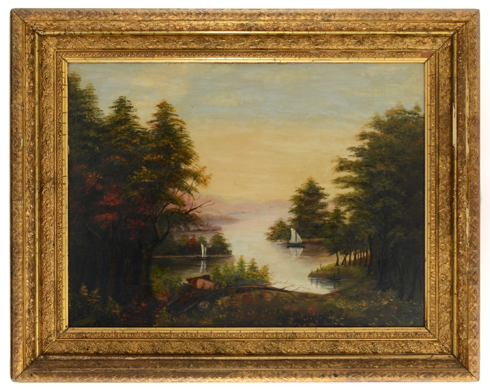NAIVE 19TH C. LAKE PAINTING WITH COWS: Oil/Board, 18 1/2'' x 24 1/2'', no visible signature, gilded molding, 25'' x 31''.