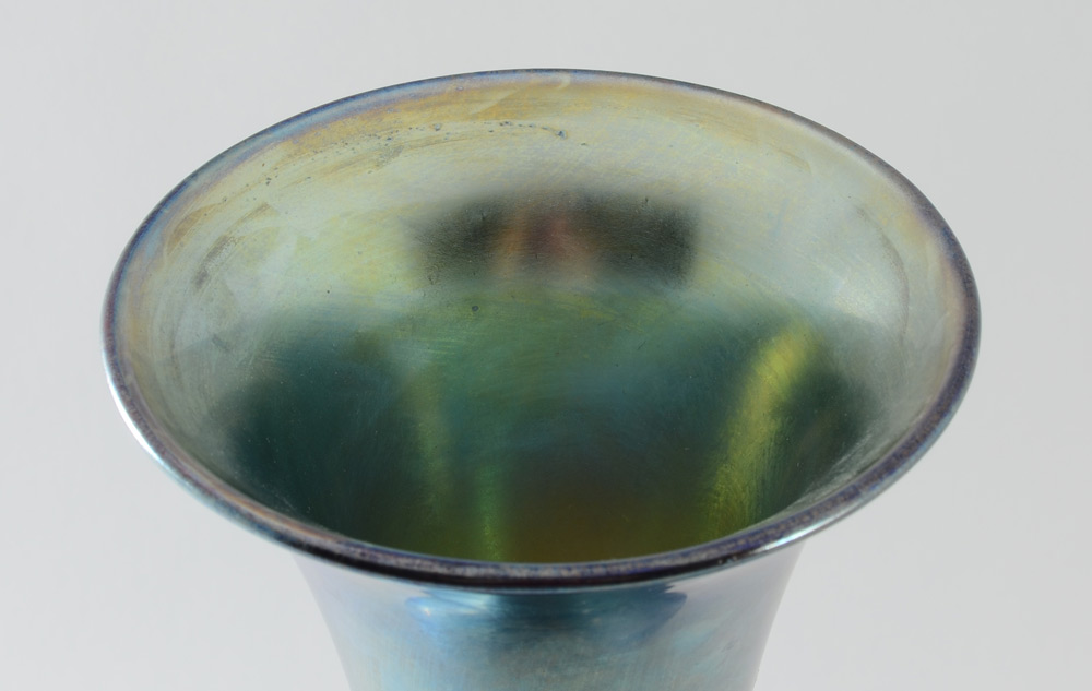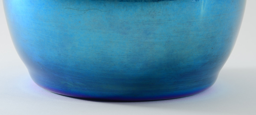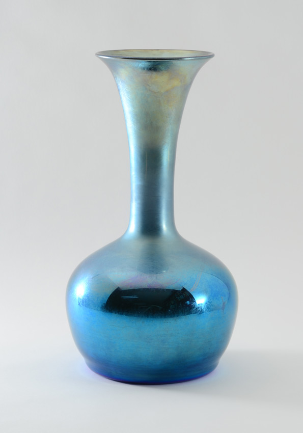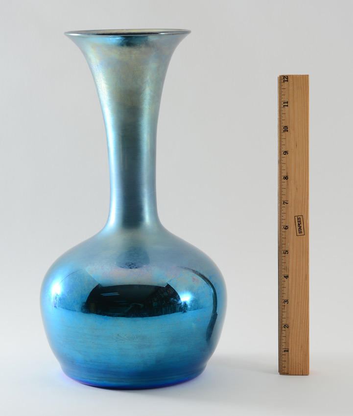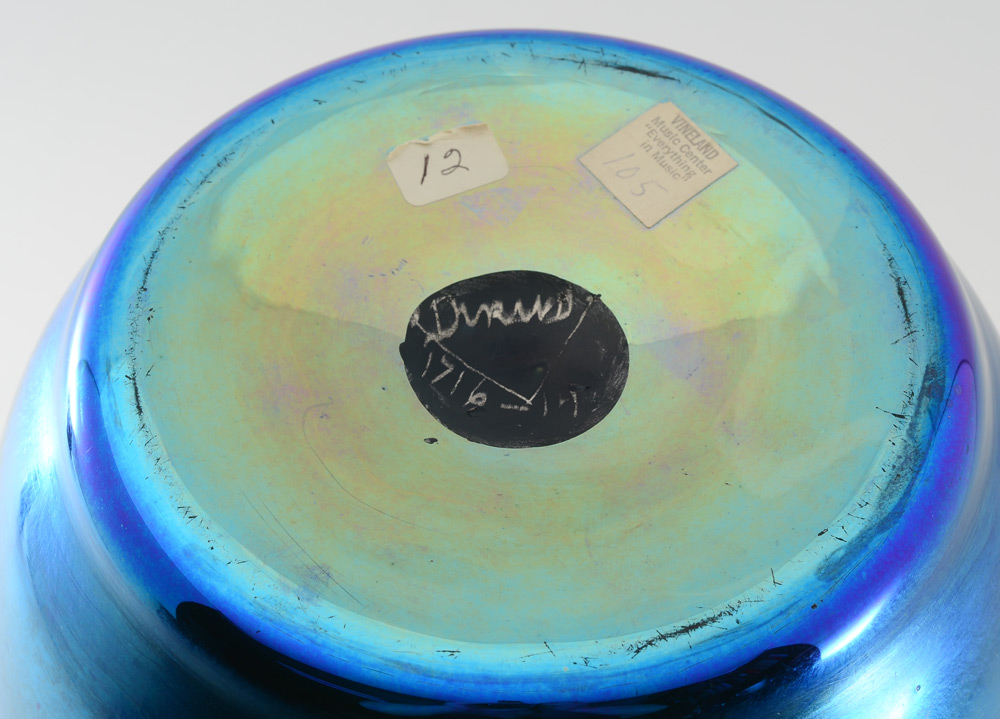 14'' DURAND IRIDESCENT ART GLASS VASE: Iridescent blue luster, flared rim, elongated neck, bulbous body, signed on base Durand 1716-14. Original Vineland Music Center sticker. 14'' h. x 7 1/2''.