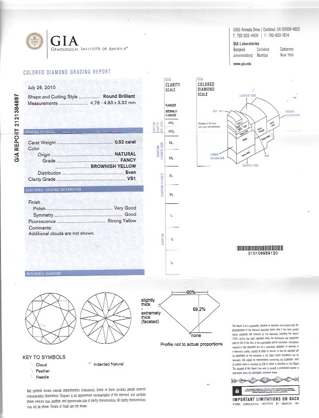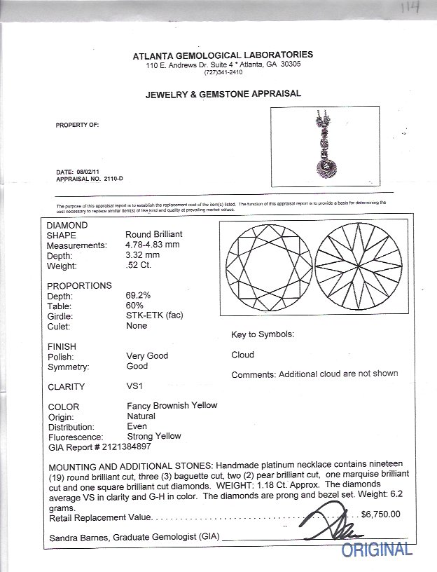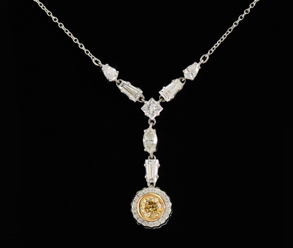 PLATINUM FANCY YELLOW DIAMOND DROP NECKLACE: Handmade platinum necklace featuring a GIA certified natural yellow diamond, approx. .52 Ct., rated VS1 in clarity. An additional 1.18 Ctw of diamonds complete this very feminine look in 19 round brilliant, 3 baguette, 2 pear brilliant, 1 square brilliant and 1 marquise brilliant cut diamond. These diamonds average VS in clarity and G- H in color. Prong and bezel set. 17'' length with a 1'' drop. Weight 6.2 grams. Sold with current Atlanta Gemological's GIA graduates appraisal for $6,750. GIA report number #2121384897.