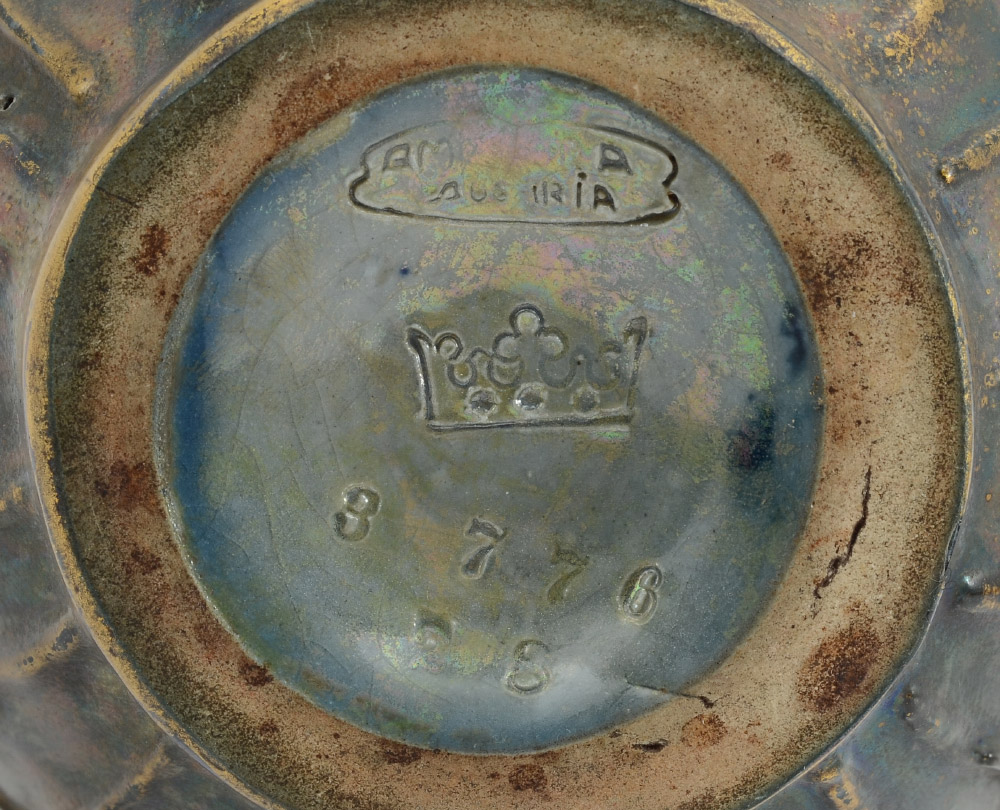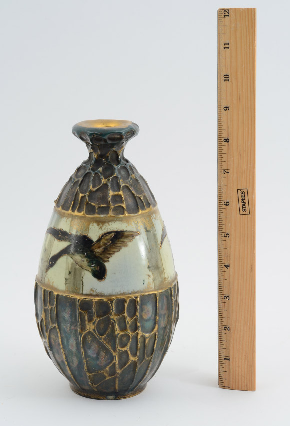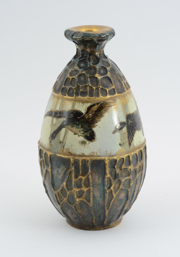 AMPHORA DUCK MOTIF POTTERY VASE: Raised gilt decoration on mottled green brown with center strip of ducks in flight. Marked Amphora Austria, crown and 3 776 28. 8 1/2'' h. x 4 1/2''.
