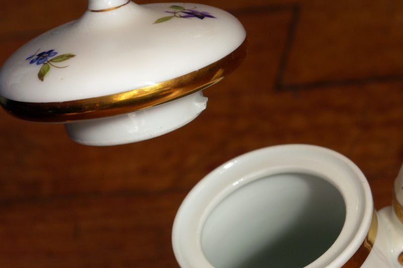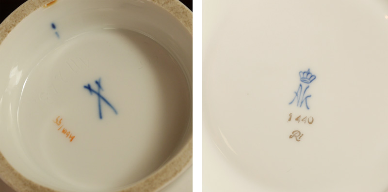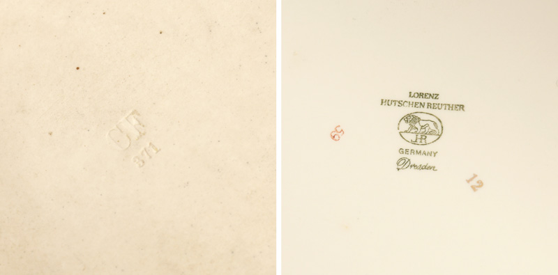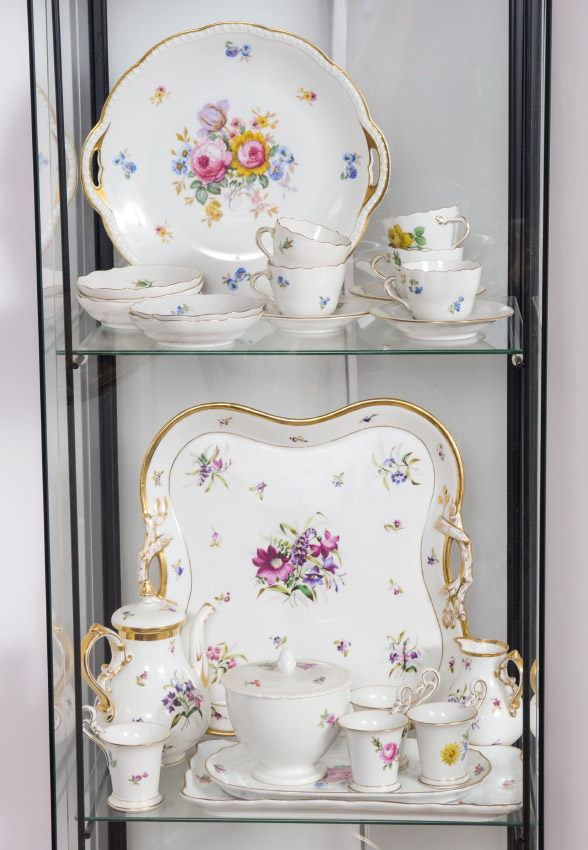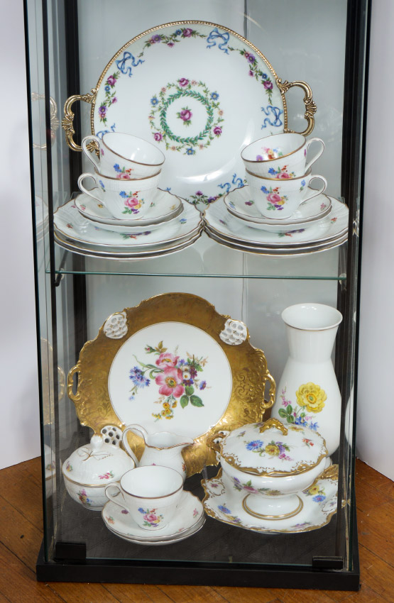 ESTATE GATHERING OF MEISSEN AND DRESDEN TYPE FLORAL DECORATED PORCELAIN: Approx. 50 pieces to include MEISSEN: Vase(9''), covered bowl (4''x 4.5''), 6 small bowls (4.5''), 5 demi cups, 4 swan handle flat bottom demi cups and 3 saucers. HUTSCHENREUTHER Dresden pattern: Oval tray (9.5''), rectangular tray (11.5''), creamer, sugar, 5 cups, 6 saucers and 6 plates (7.5''), KAISER: covered sauce dish and underplate(8x8), WEIMER; cake plate (10.5''), BAVARIAN reticulated plate and an HEINRICH ormolu mounted plate (13'' including handles).