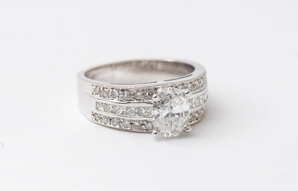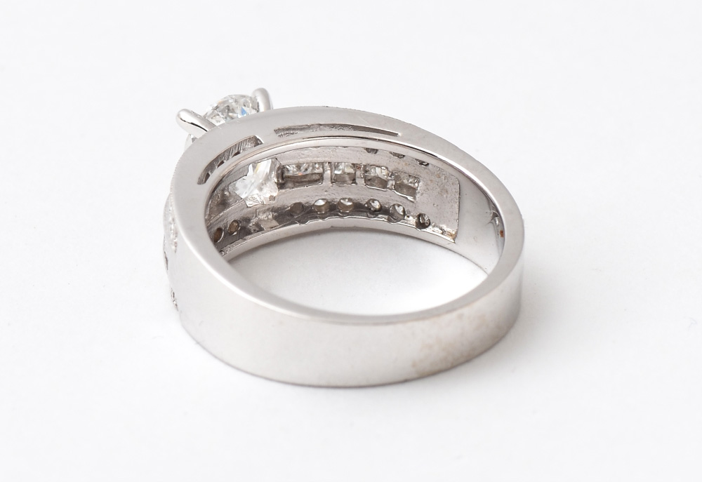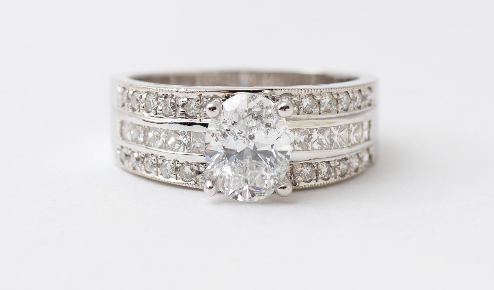 1.15 CT CENTER DIAMOND RING: 18K white gold ring centering a single oval brilliant diamond of 1.15 Ct., rated I1 in clarity and E in color. The additional 24 round brilliant cut diamonds and 10 square brilliant cut diamonds total approx. .56 Ct. are rated VS-SI in clarity and H-I in color. The diamonds are prong and channel set. Weight: 6.8 grams. Size: 6.5