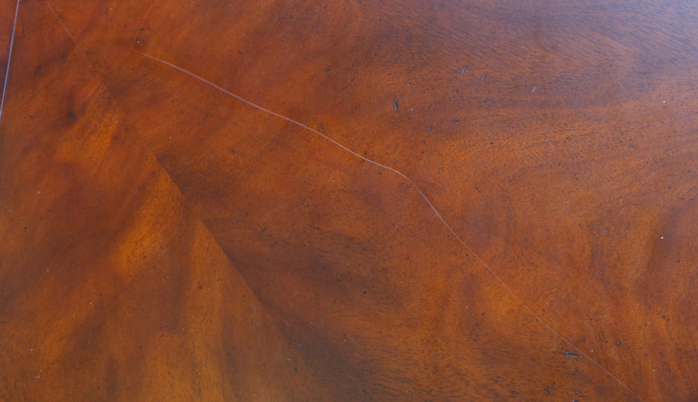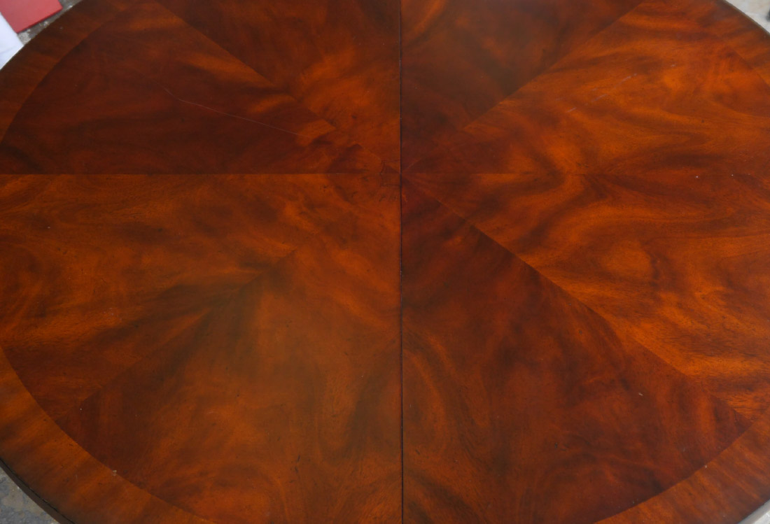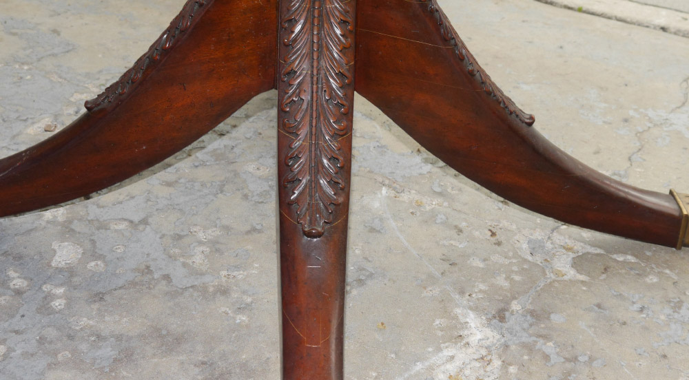 MAITLAND SMITH MAHOGANY BANDED DINING TABLE: Round top, carved pedestal base over 4 splayed carved legs ending in paw brass cap feet. Overall measures 30'' h. x 54'' dia.