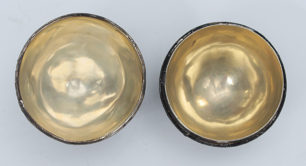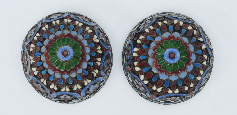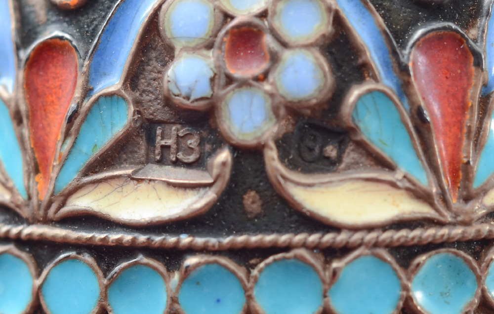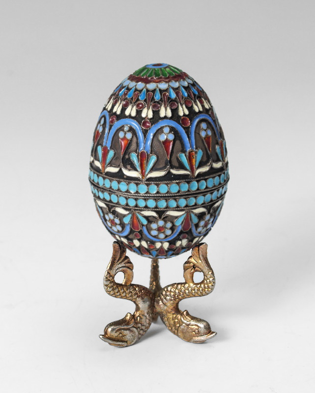 NICHOLAI ZUGERYEV ENAMELED RUSSIAN SILVER EGG: Diminutive egg hallmarked with Nicholai Zugeryev cypher and simple 84 zolotnik mark. Floral garland motifs, overall measures 2 3/8'' x 1 3/4'', approx. 2.6 troy oz. Sold with a gilt metal figural dolphin stand.