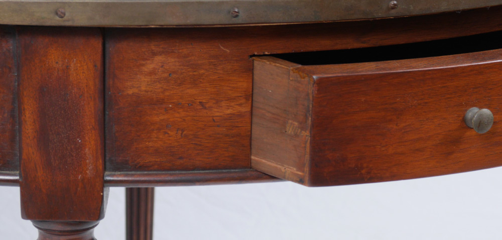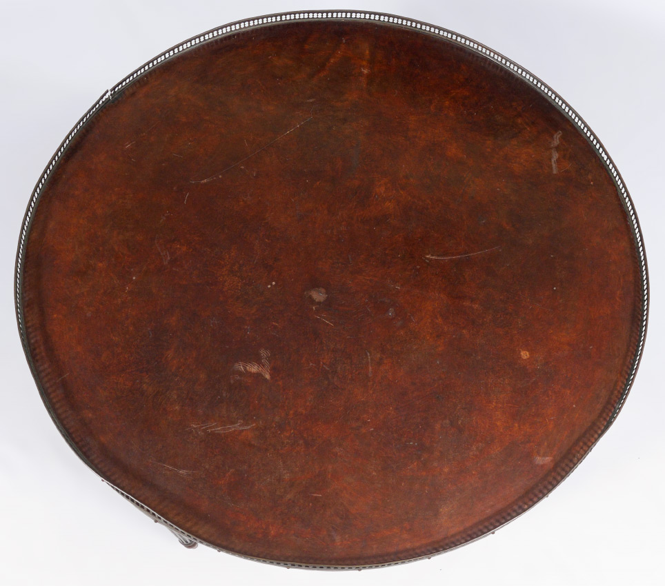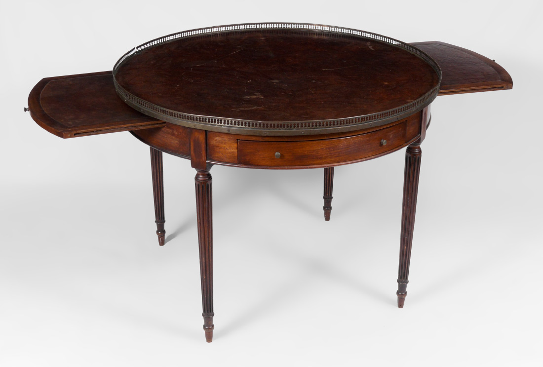 FRENCH LEATHER INSET ROUND TABLE: Pierced brass gallery over round circular top. Skirt with single drawer and 2 slide out shelves, tapered fluted legs. Overall measures 29 3/4'' h. x 40'' dia.