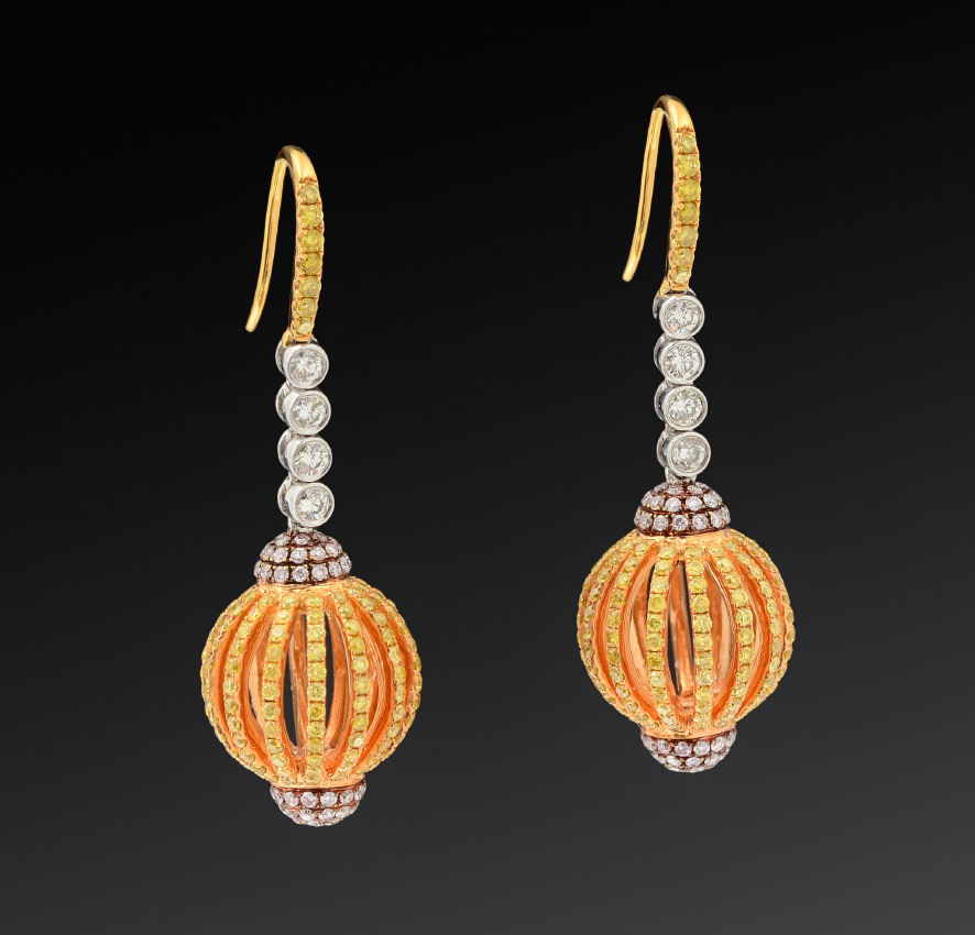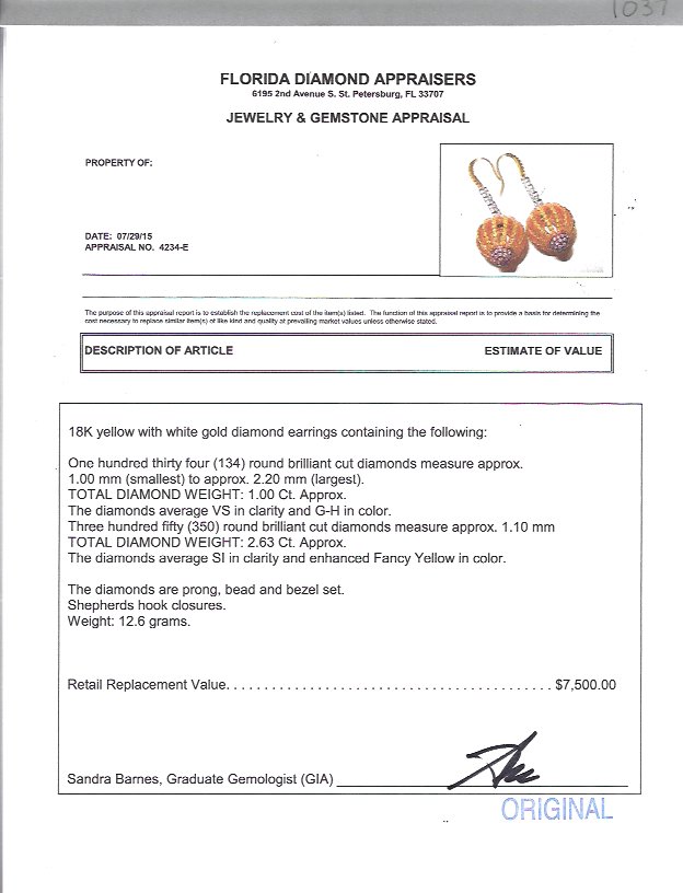 18K DANGLING CAGE DIAMOND EARRINGS: Yellow gold ball shaped cage earrings with white diamonds totaling approx. 1.00 Ct., of VS clarity and G-H color. The cage and hooks are set with Fancy Yellow diamonds totaling approx 2.63 and are of SI clarity. TOTAL diamond weight is 3.73 Ct. Length 1.5''. Weight 12.6 grams. Sold with current Florida Diamond Appraisers GIA graduates appraisal for $7,500.