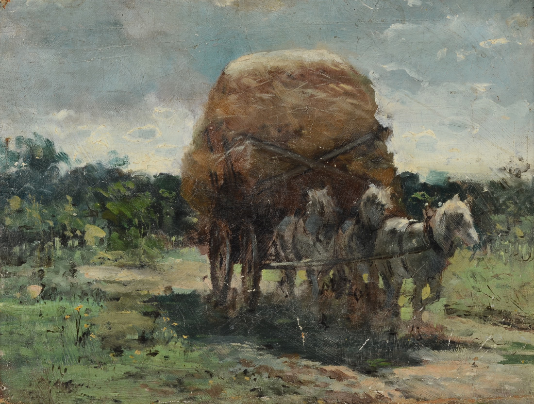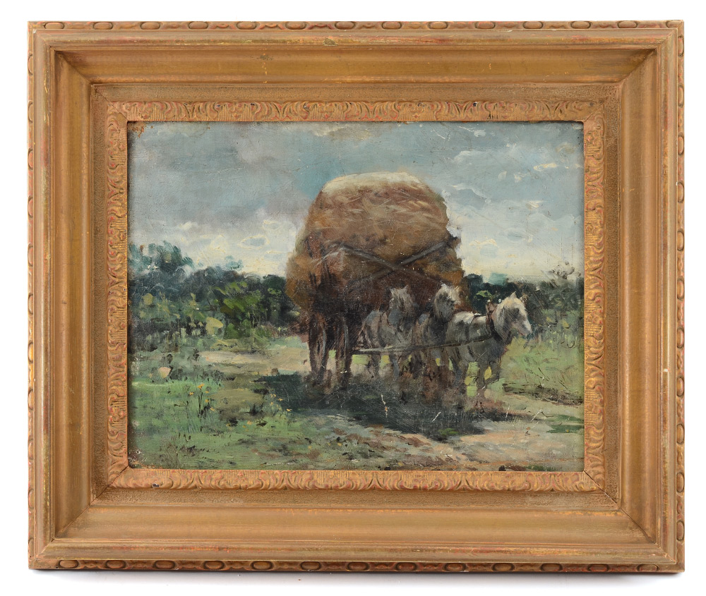 FINE IMPRESSIONIST HAY CART PAINTING: Oil/Board, sight size 12 1/2'' x 16'', gilded and carved frame, 19'' x 22 1/2''.