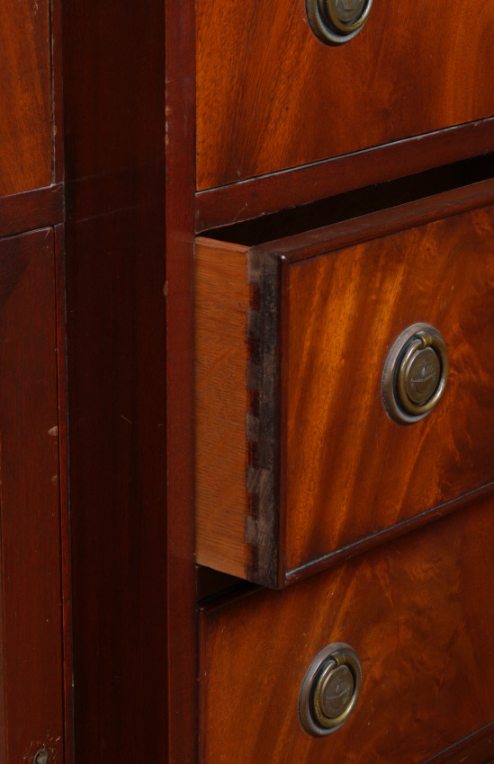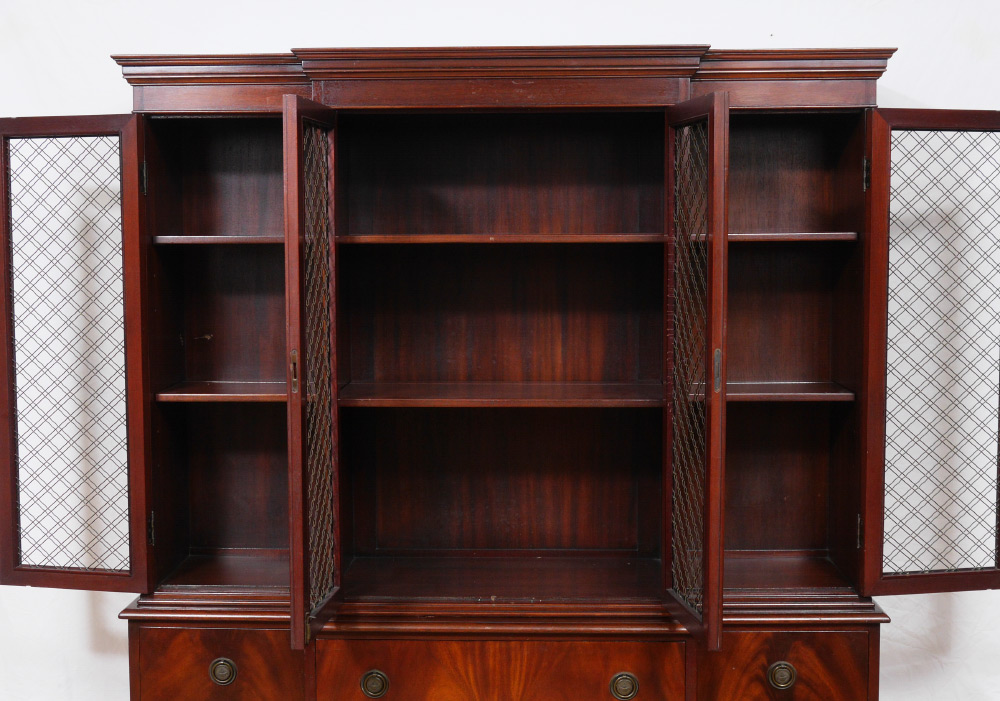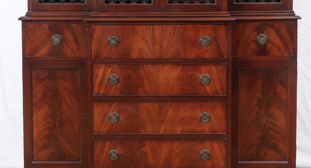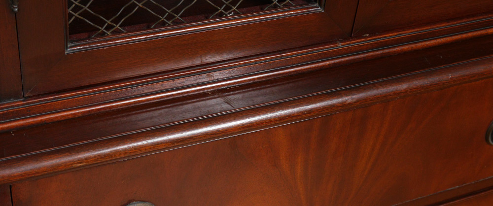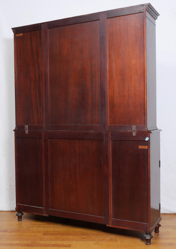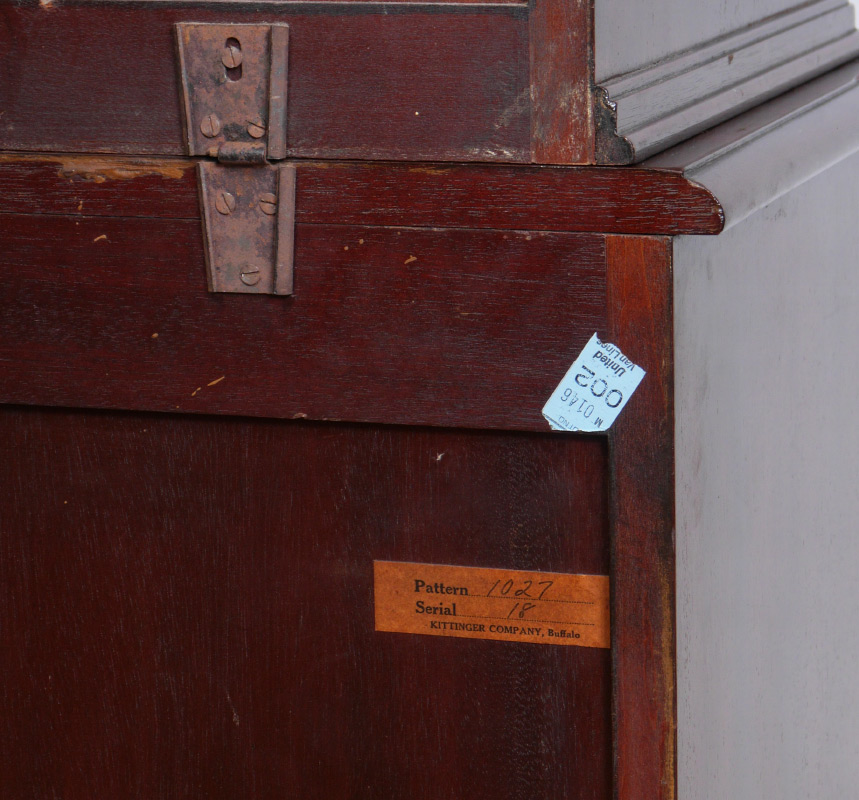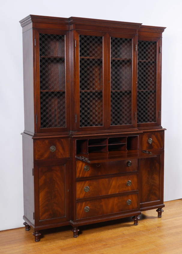 KITTINGER GAINSBOROUGH SECRETARY BOOKCASE: Mahogany case, pattern 1227, serial 18 label on back. Top section with 4 wire front doors, wood shelves. Base with drop front secretary door in center over 3 drawers, single drawer over single door either side, turned feet. 74 3/4'' h. x 54 1/4'' x 16 1/4''.