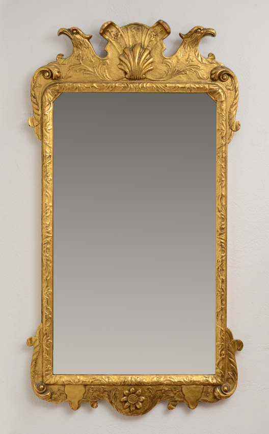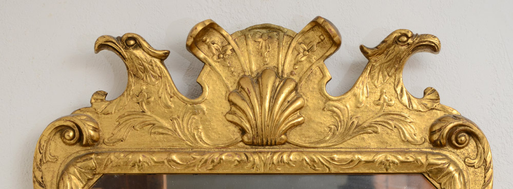 KITTINGER COLONIAL WILLIAMSBURG MIRROR: CWLG6. Rich gold gilt gesso frame surmounted by carved shell flanked by eagle heads. 40'' h. x 21 3/4'' x 1 1/2''.
