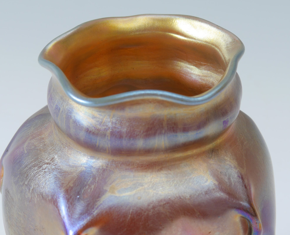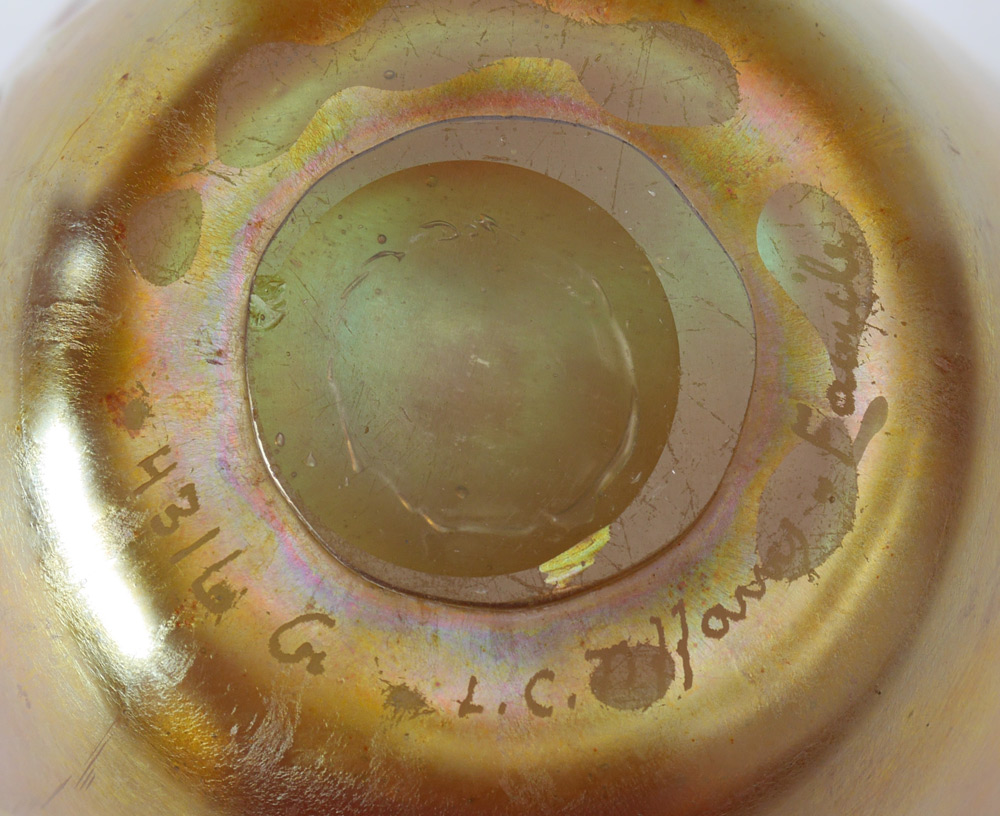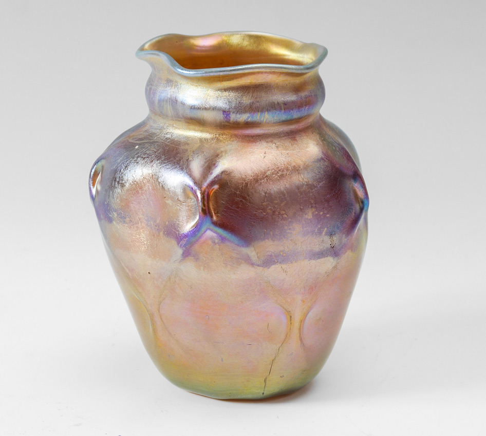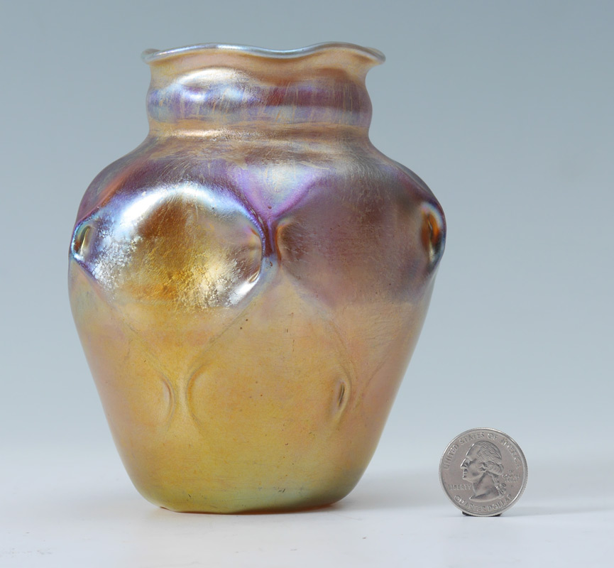 TIFFANY GOLD FAVRILE PINCHED VASE: Rolled rim, bulbous neck, gourd body with pinched shoulders. Signed on base ''4316 G L. C. Tiffany Favrile''. 5 1/4'' h. x 4''. CONDITION: Approx. 1'' long series of scratches near base, spotting of ash on one face.