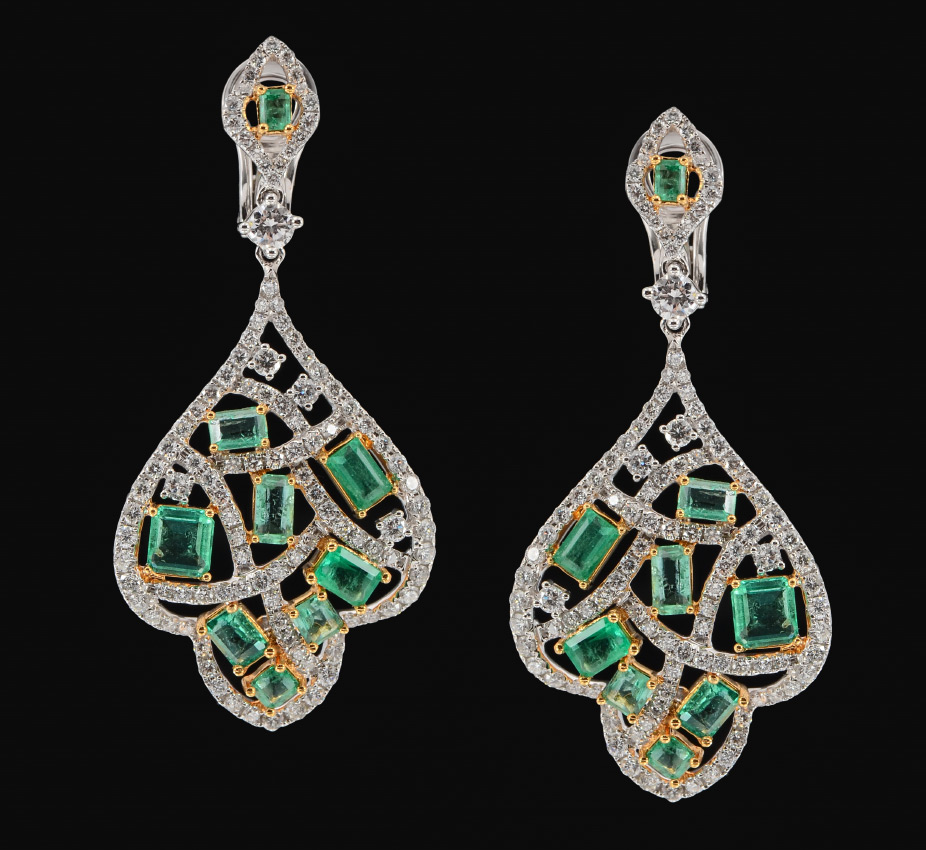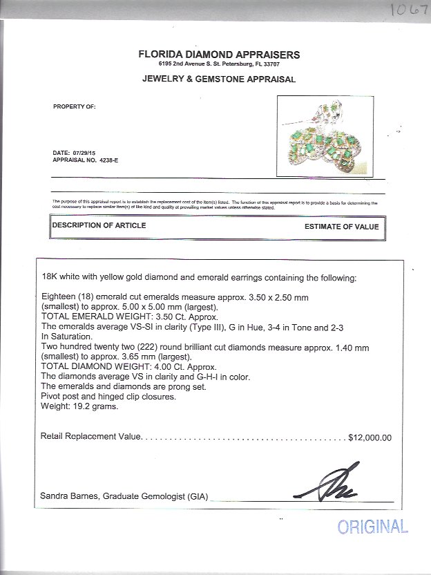 18K DIAMOND AND EMERALD EARRINGS: Show stopping 18K white gold earrings with 18 emerald cut emeralds totaling approx. 3.50 Ct., rated VS-SI clarity. The diamonds total approx. 4.00, are rated VS in clarity and G-H-I color. The emeralds are in 14k yellow gold. Pivot post and hinged clip closure. Length 2''. Weight 19.2 grams. Sold with current Florida Diamond Appraisers GIA graduates appraisal for $12,000.