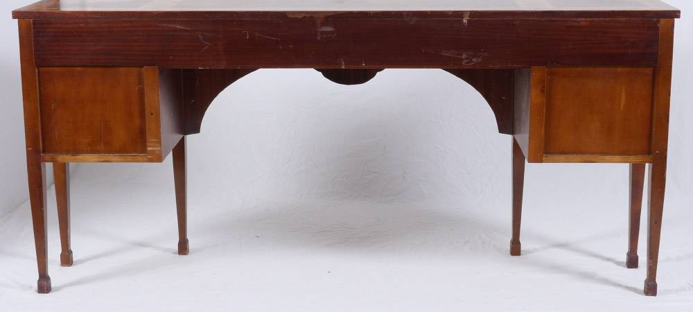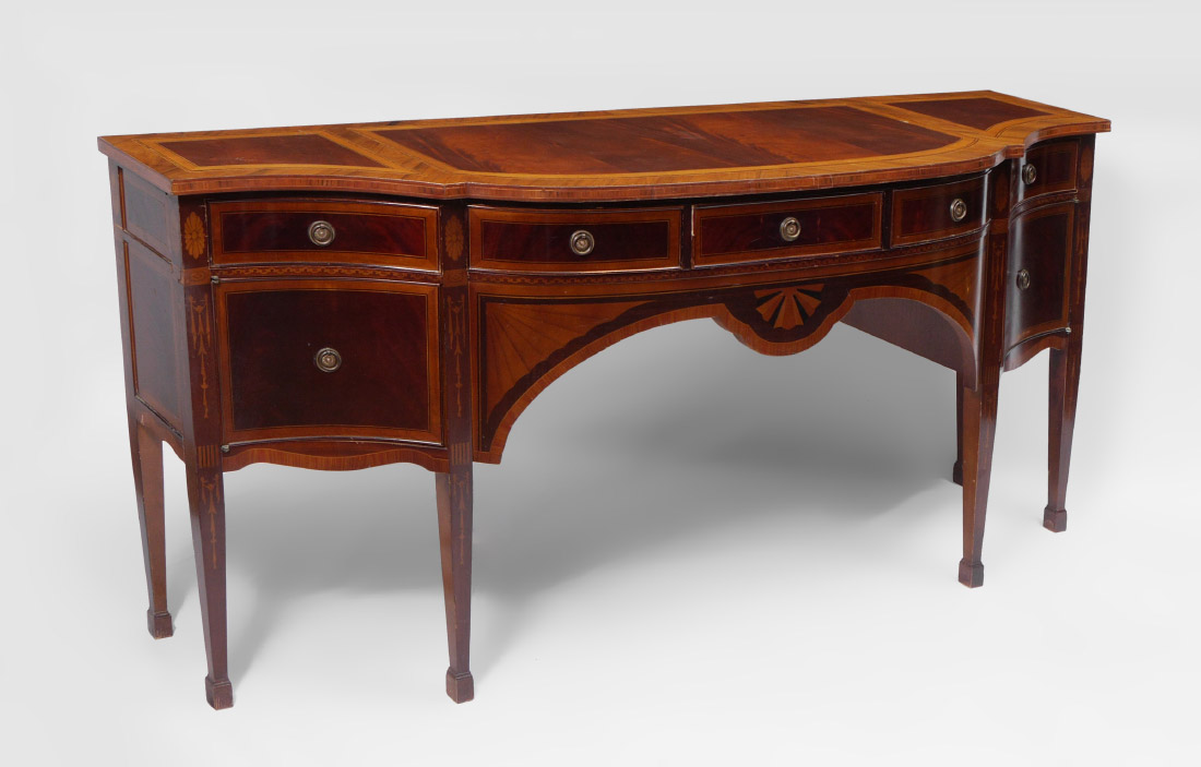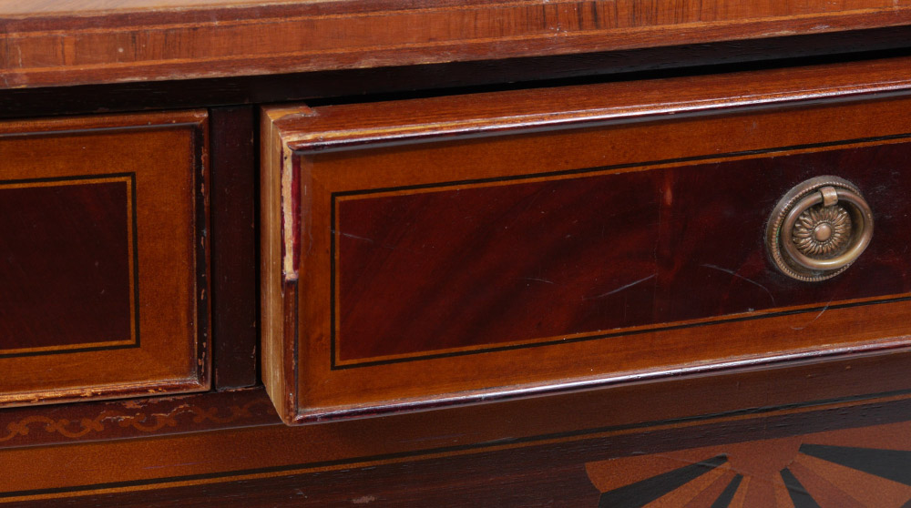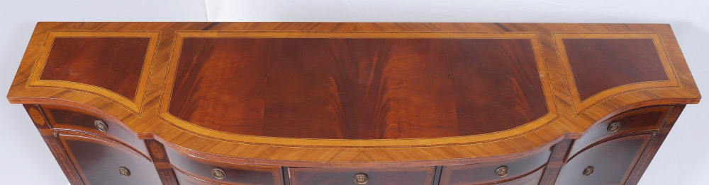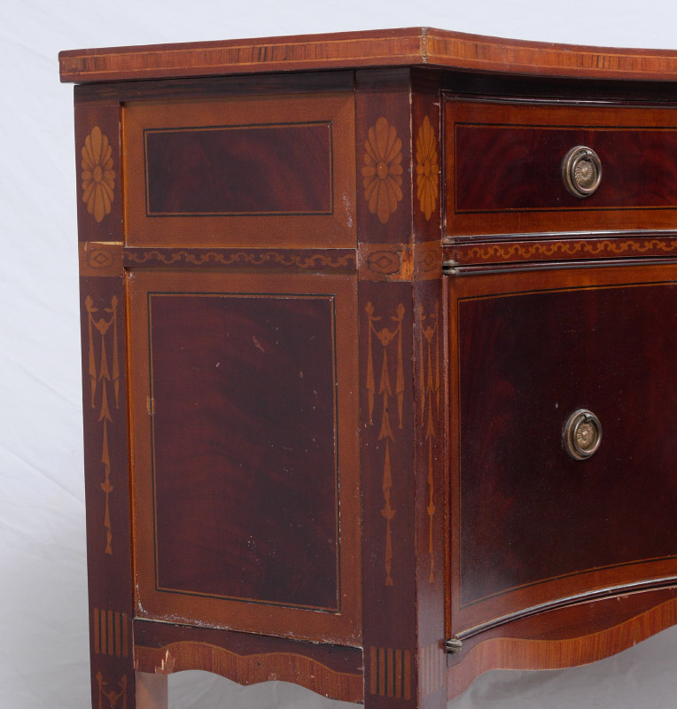 SHERATON STYLE MARQUETRY INLAID SIDEBOARD: Banded mahogany and inlaid shaped top, 3 central drawers over shaped skirt with marquetry inlay. Single drawer over single door either side, marquetry inlay floral motifs on legs. 35'' h. x 78 1/2'' x 21 1/4''.