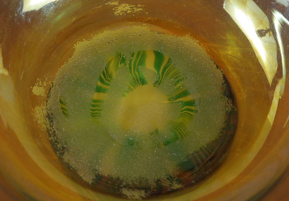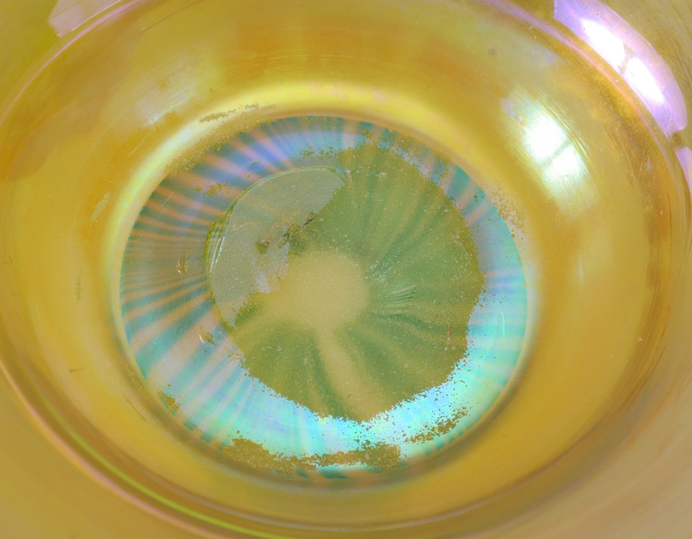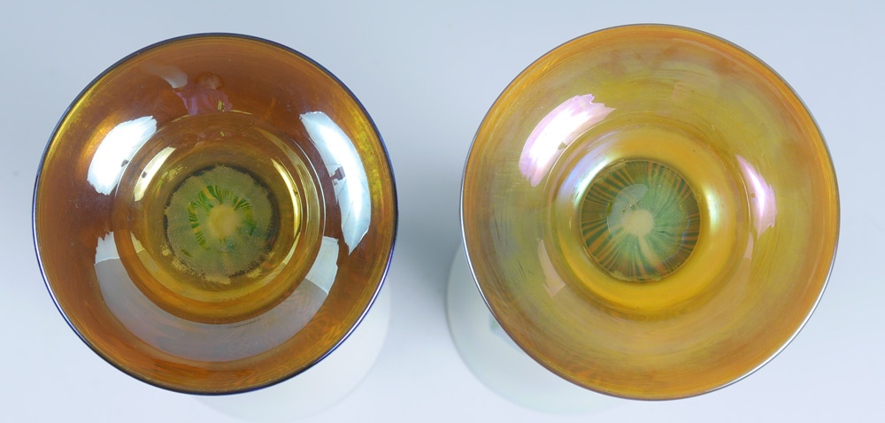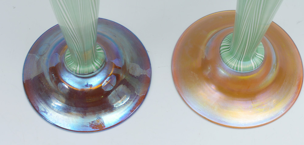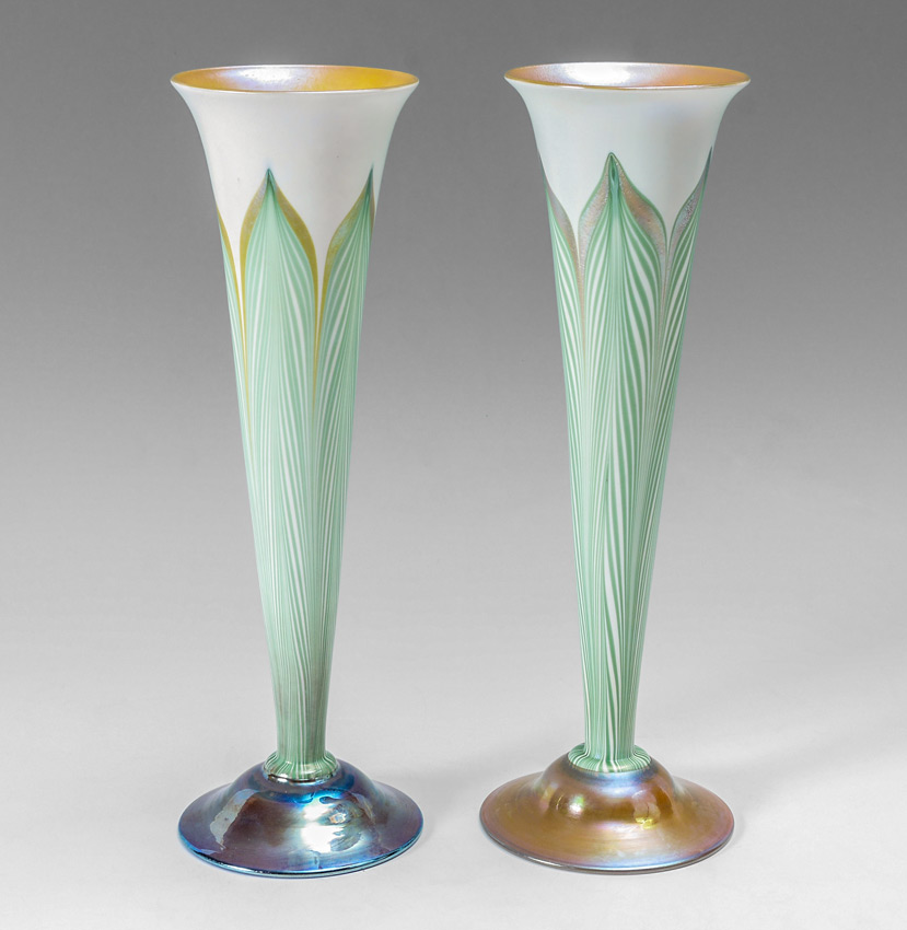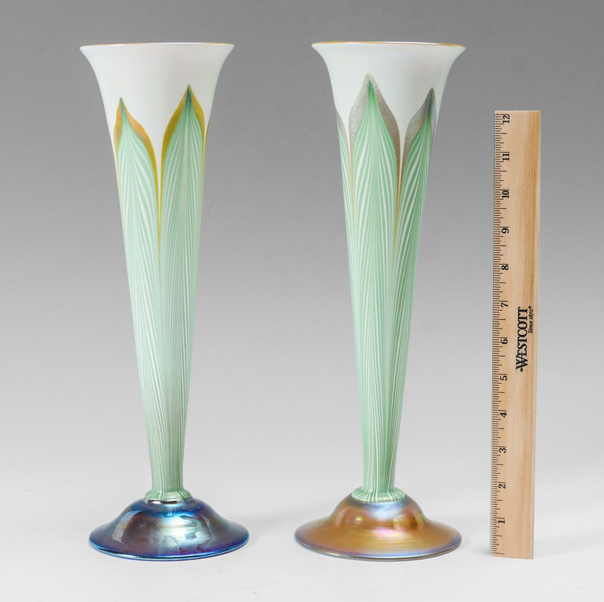 PAIR IRIDESCENT PULLED FEATHER TRUMPET VASES: 2 trumpet vases with similar but not identical iridescent bases, pulled feather bodies, flared rims, iridescent gold interiors. Unmarked, but of the quality of Tiffany or Quezal. Overall measures 14'' h. x 4 3/4''.
