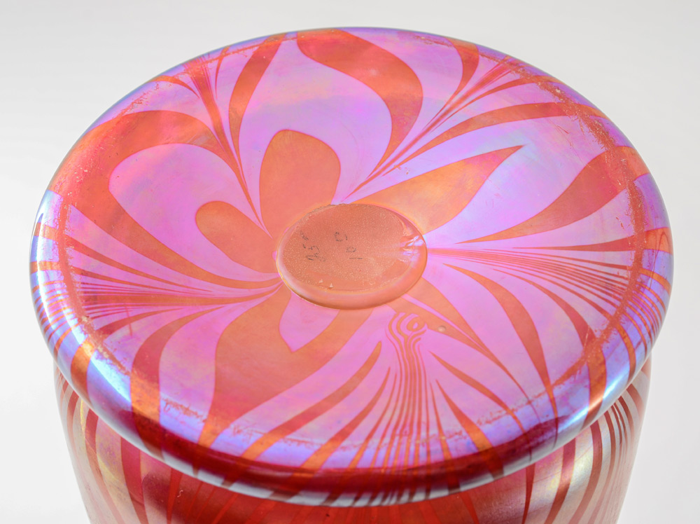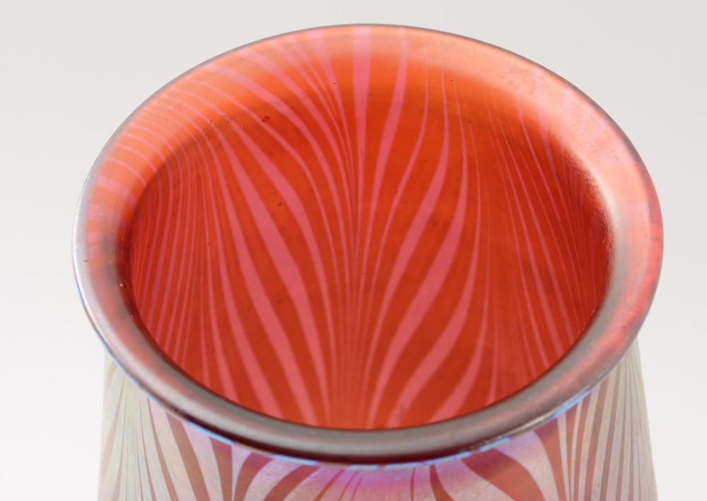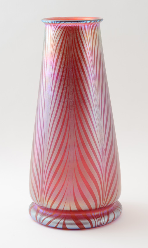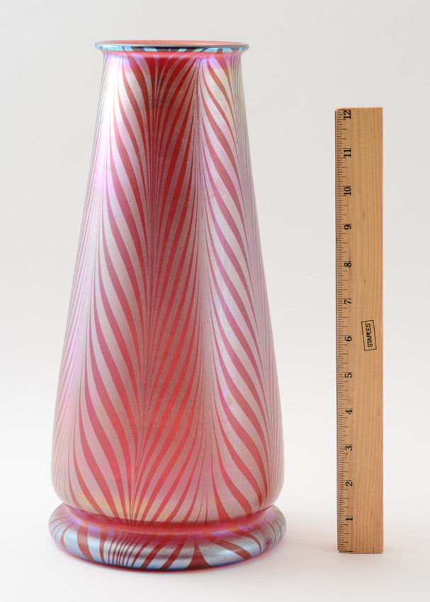 TALL IRIDESCENT RUBY PULLED FEATHER ART GLASS VASE: Flared rim, tapered body with iridescent red ground, silver pulled feather design. Unmarked, overall 13 3/4'' h. x 6 3/4''.