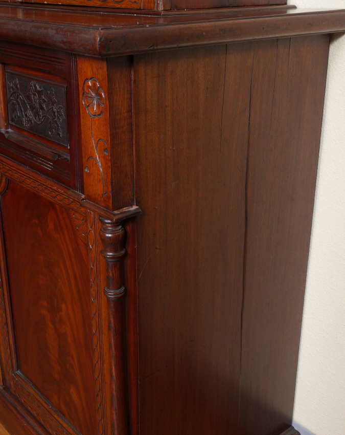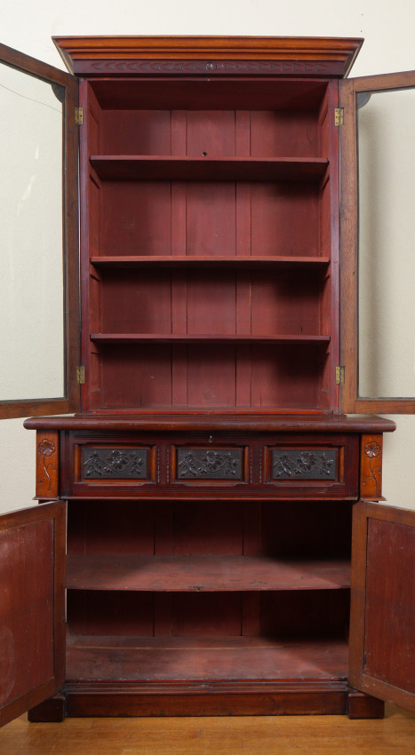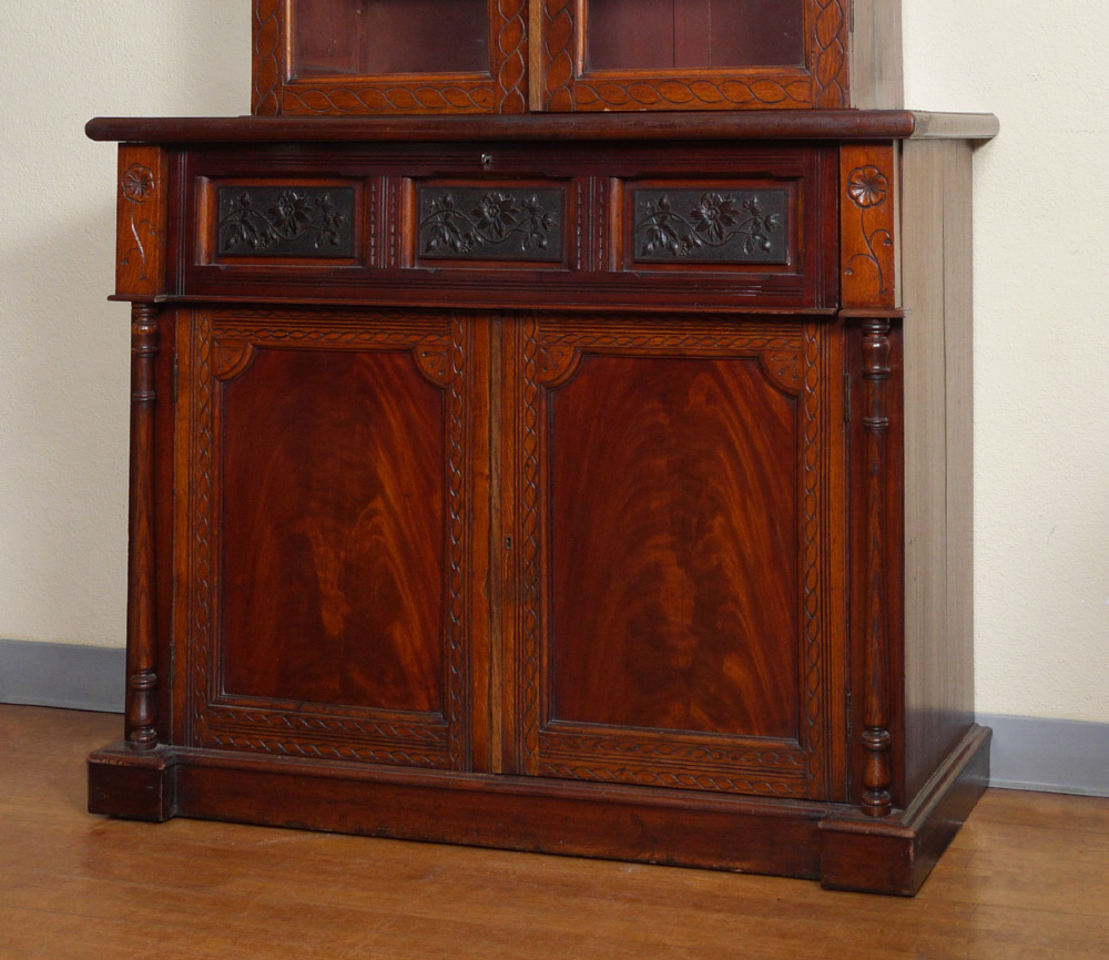 VICTORIAN MAHOGANY SECRETAIRE BOOKCASE: Stepped pediment over carved trim, 2 glass doors with 2 wood shelves. Base with secretaire drop front top drawer, green felt writing surface, pigeon holes and drawers with doorknocker pulls. 2 lower blind doors, full column stiles. Overall measures 78 3/4'' h. x 45'' x 19 3/4''.