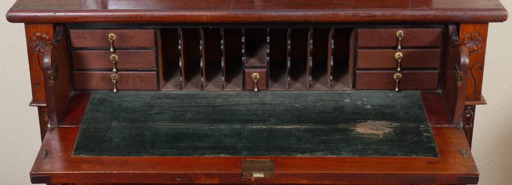 CONDITION: Crack to one glass panel, felt writing surface well worn, other wear consistent with age and everyday use. Keys in office.
