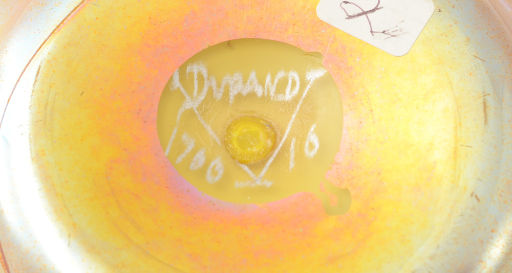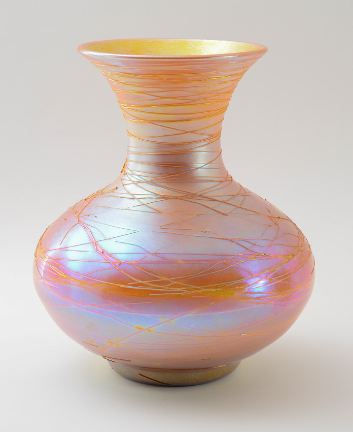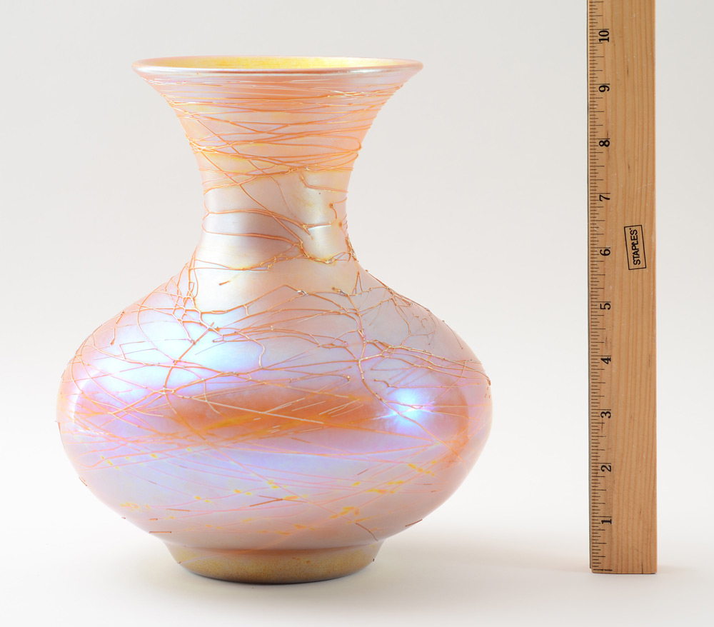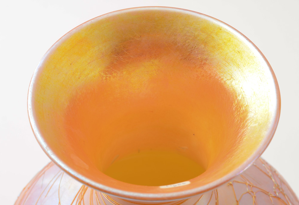 LARGE DURAND GOLD THREADED ART GLASS VASE: Squat vase with flared rim, bulbous body, gold luster with threads. Marked on base with possibly later added Durand, 1700-10 mark. Overall 9 3/4'' h. x 8''.