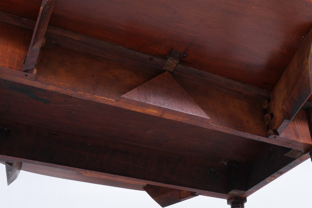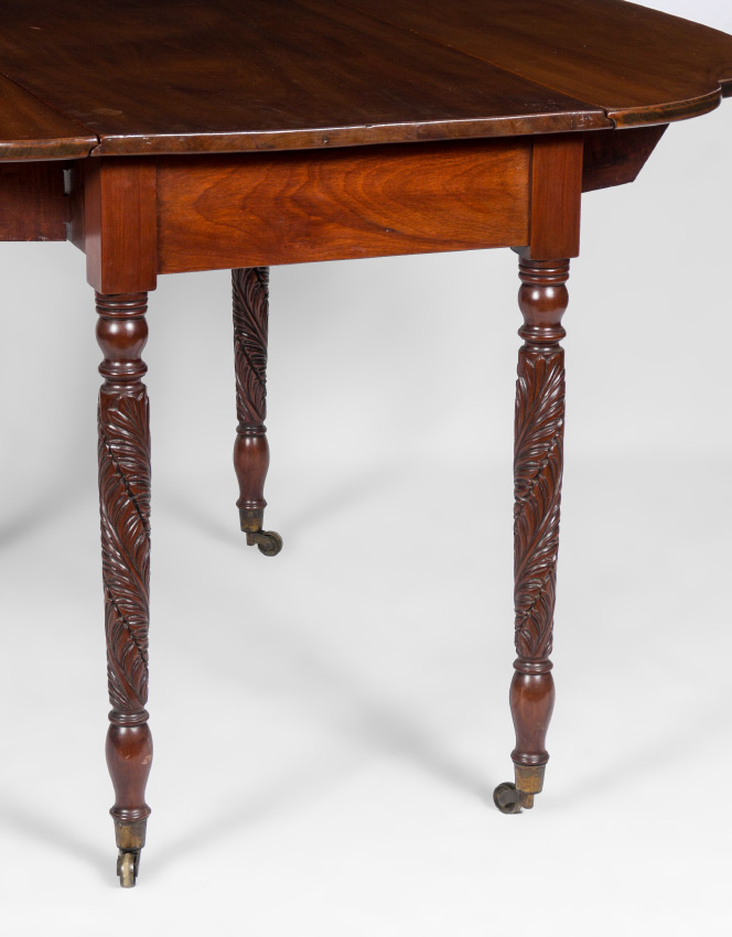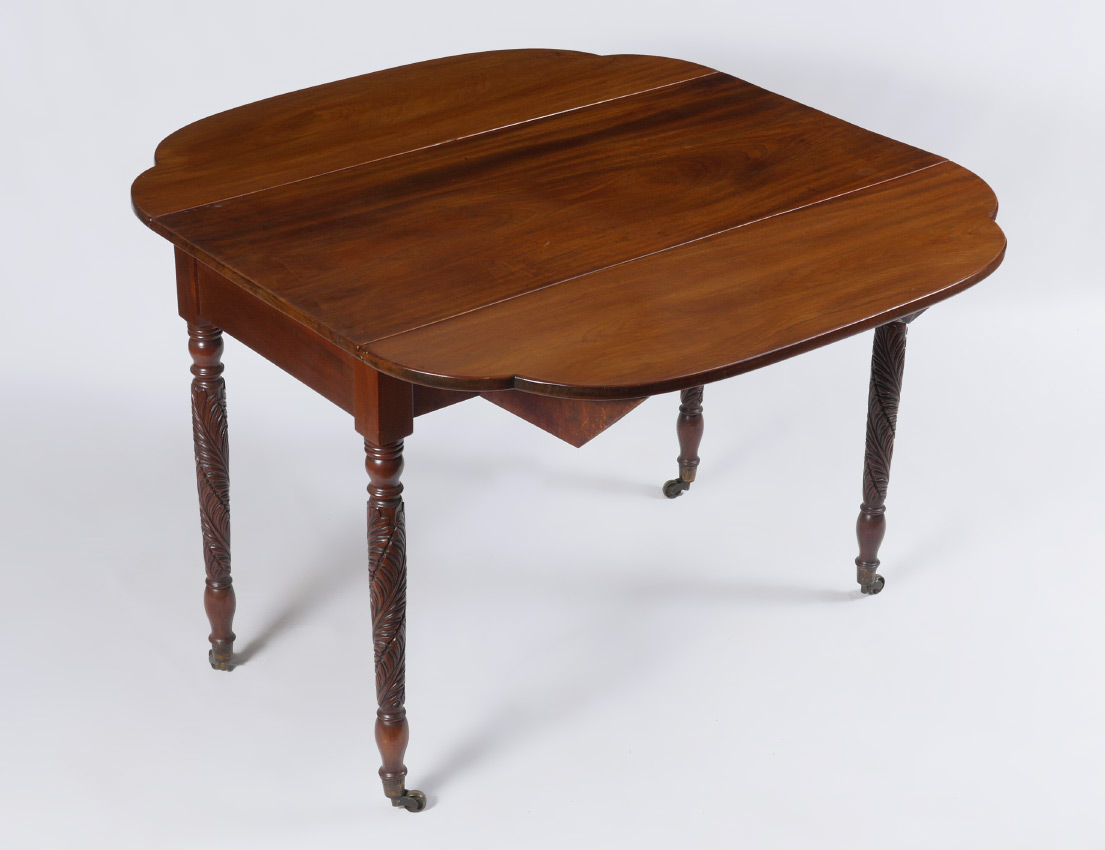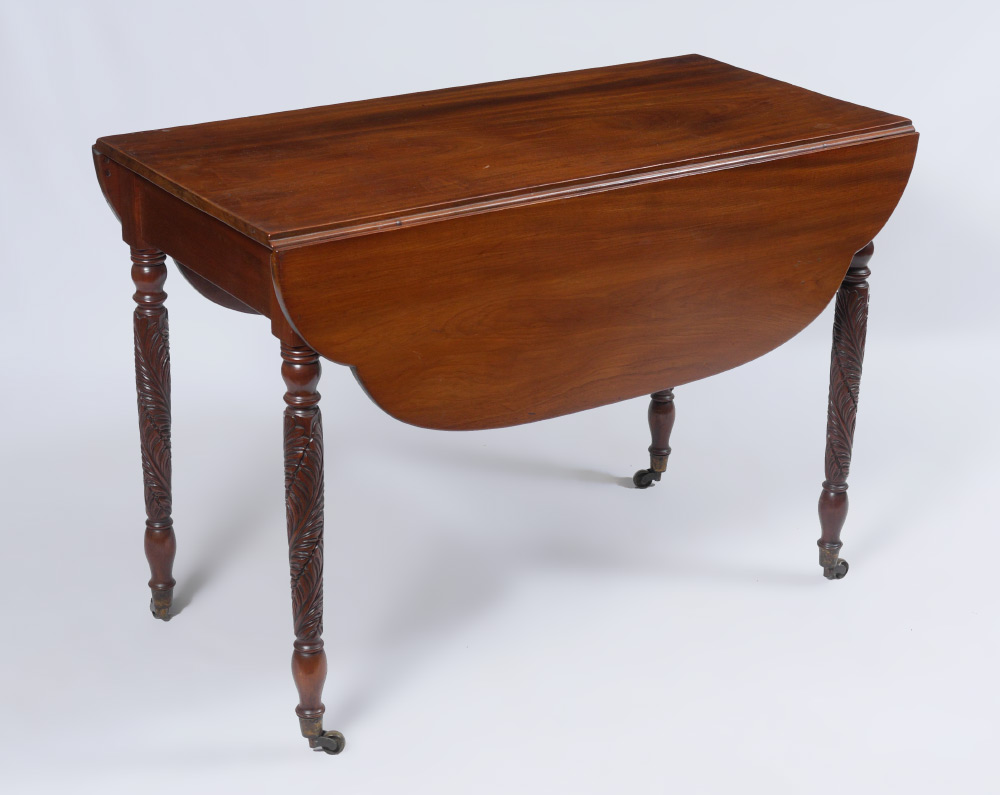 19TH CENTURY AMERICAN PEMBROKE DROP LEAF TABLE: Early 19th century, single board top with shaped drop leaves, profusely carved legs ending in castors. 28 3/4'' h. x 40 3/4'' x 20 1/2'', leaves 12''.