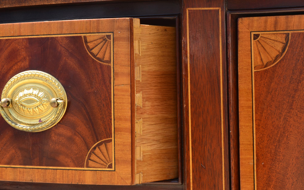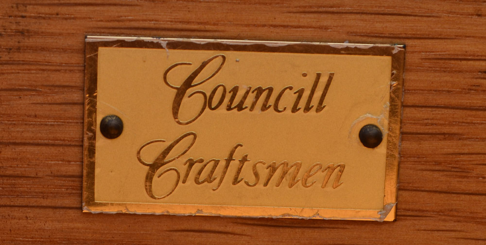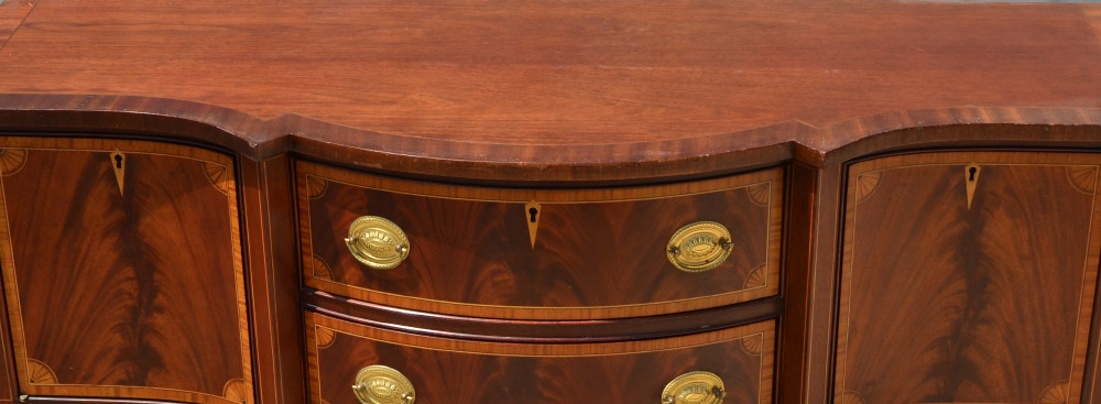 COUNCILL FURNITURE BANDED MAHOGANY SIDEBOARD: Sheraton style, banded shaped top with string inlay, 2 central drawers and 2 side doors with fruitwood inlay, Councill Craftsman tag inside drawer. Tapered legs, overall 38 1/2'' h. x 58 1/4'' x 21 1/4''.