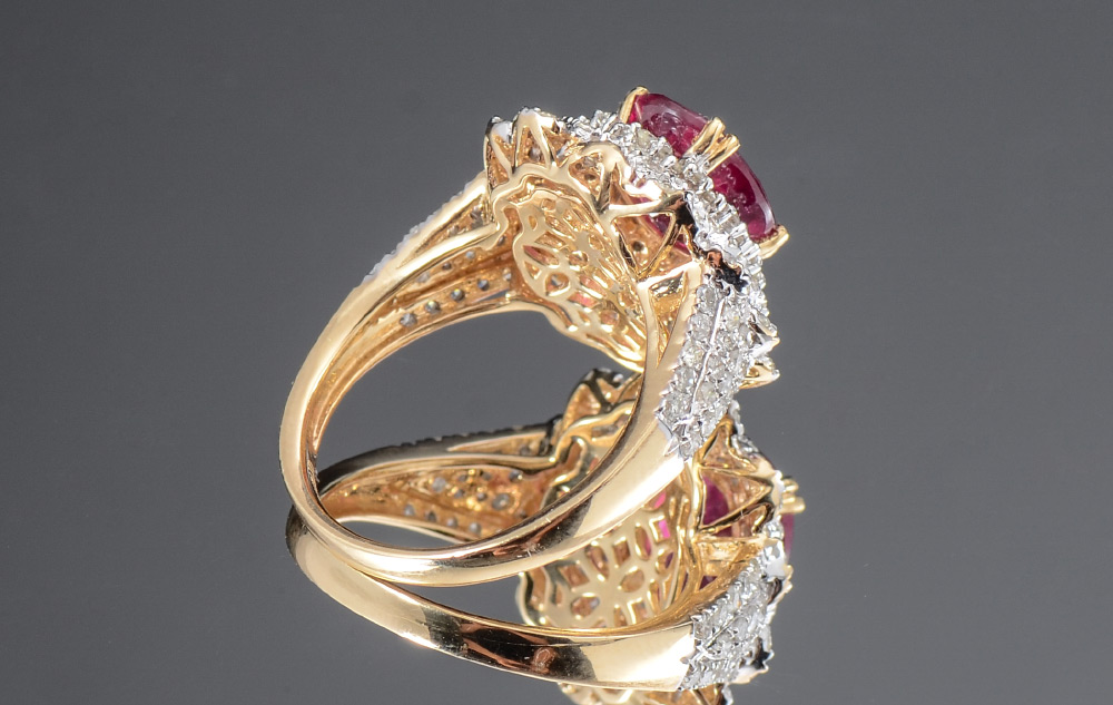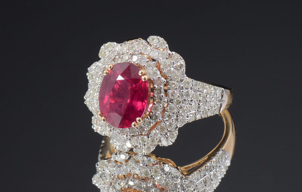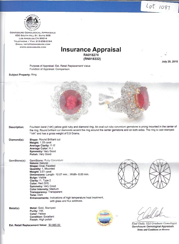 14K RUBY AND DIAMOND RING: 14K white and yellow gold ring centering an approx. 3.51 Ct oval faceted natural ruby of intense color and I1 clarity. Framing the ruby and covering the shoulders diamonds totaling approx. 1.25 Ct, of I1-I2 clarity and H-J color. Weight 5.9 grams. Size 7.5. Sold with current GemAssure Gemological GIA graduate's appraisal for $3985.