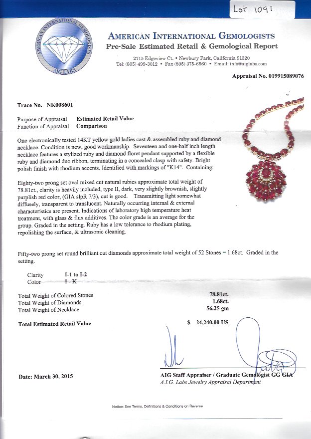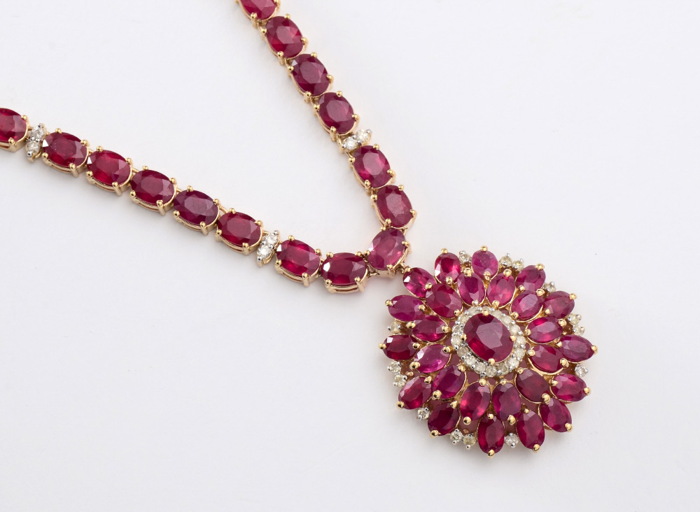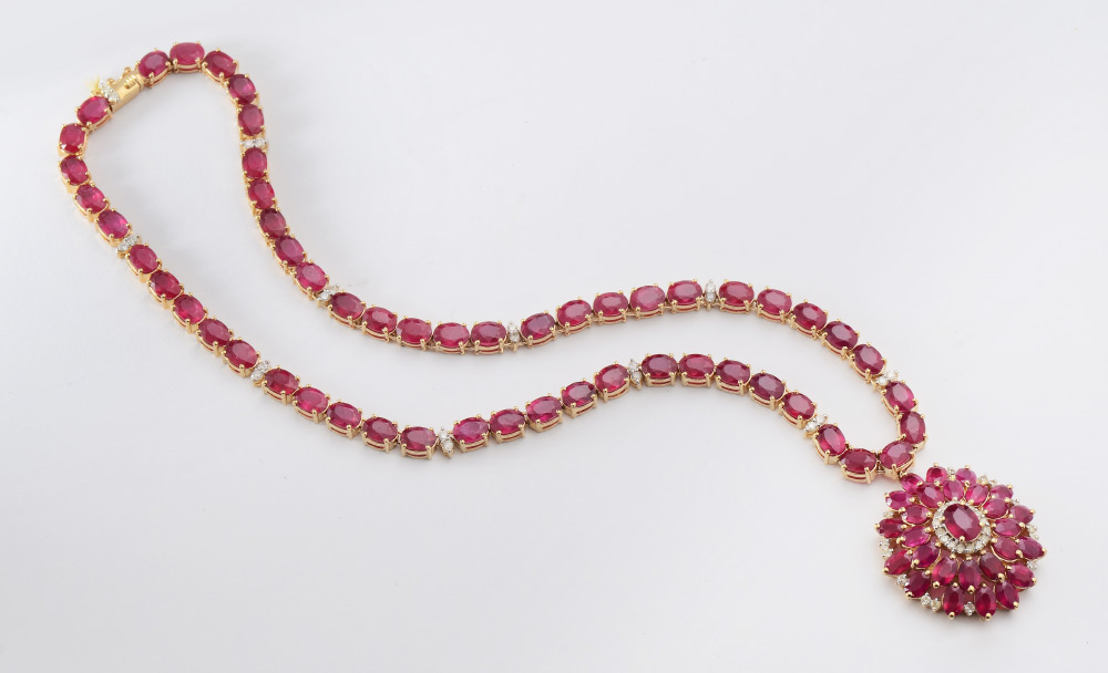RUBY PENDANT NECKLACE: 14k yellow gold necklace featuring a ruby and diamond floret pendant suspended from a flexible ruby link chain with diamond spacers. 82 oval mixed cut natural rubies total approx. 78.81 Ct. The 52 round brilliant cut diamonds total approx. 1.68 Ct, rated I1-I2 clarity and I-K color. Pendent is 1.5'' oval. Length of chain is 17.5''. Weight 56.25 grams. Sold with current AIG GIA graduate's appraisal for 424,240.