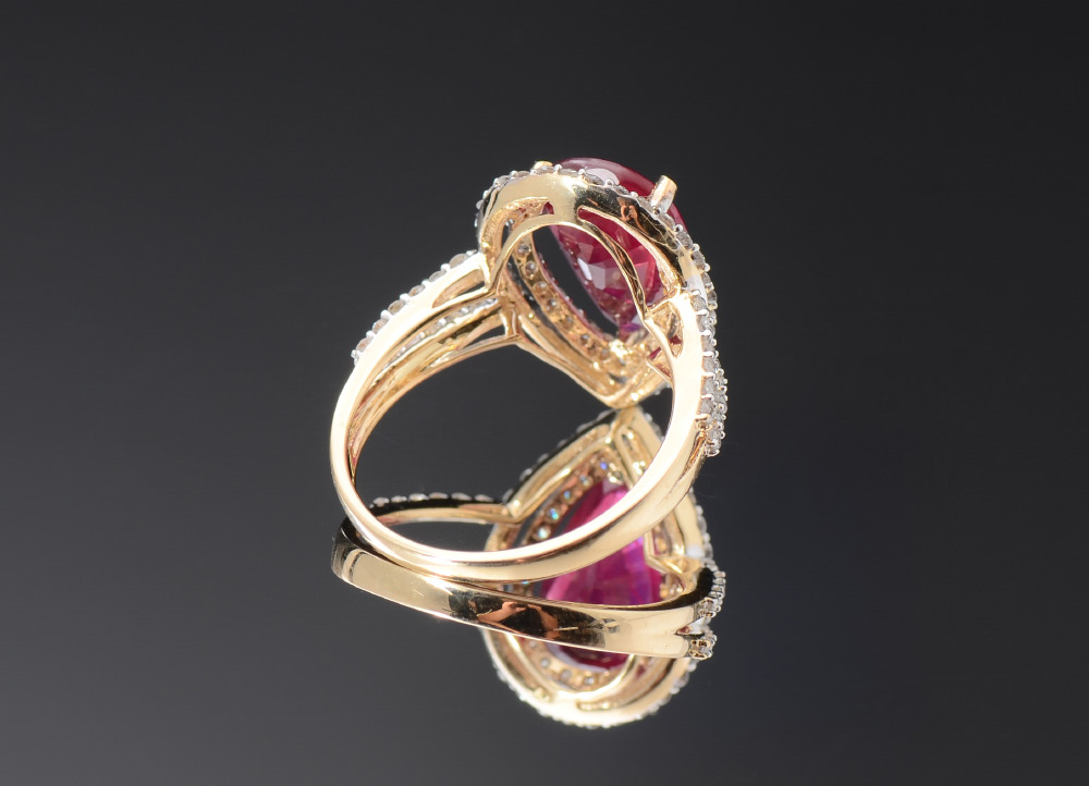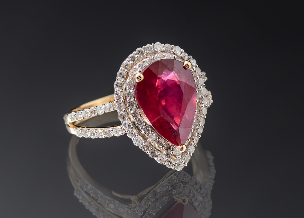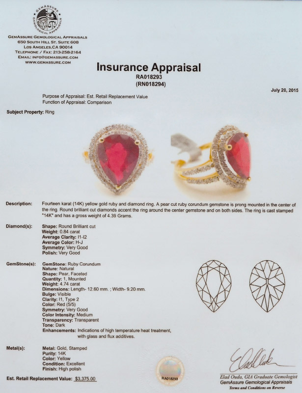 PEAR SHAPED RUBY AND DIAMOND RING: 14K yellow gold ring centering an approx. 4.74 Ct faceted pear shaped natural ruby framed with diamonds. The diamonds in the bezel and the split shoulders total approx. .84 Ct., rated I1-I2 clarity and H-J color. Size 8. Weight 4.39 grams. Sold with current GemAssure GIA graduate's appraisal for $3,375.