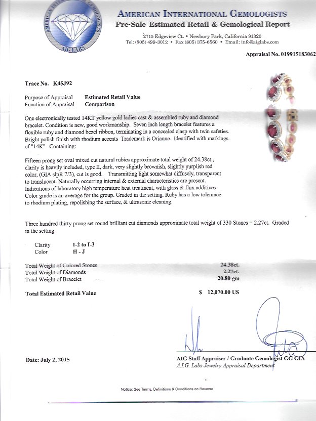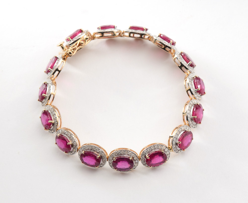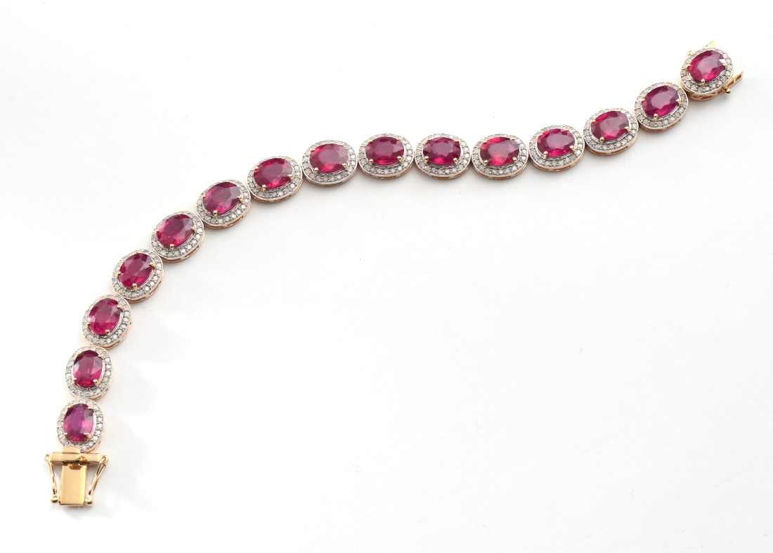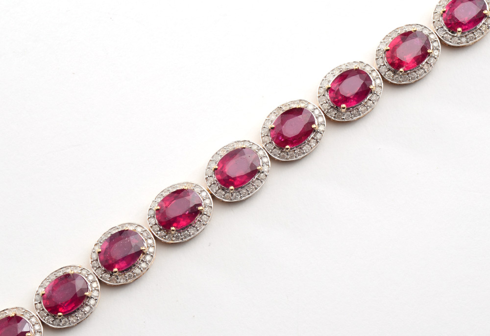 24 CTW RUBY LINE BRACELET: 14k yellow gold flexible line bracelet of 15 oval mixed cut natural rubies totaling approx. 24.38 Ct, each with a bezel of diamonds. The diamonds total approx. 2.27 Ct., are rated I2-I3, H-J color. The gold is polished finish with rhodium accents. Length 7''. Weight 20.80 grams. Sold with current AIG GIA graduate's appraisal for $12,070.