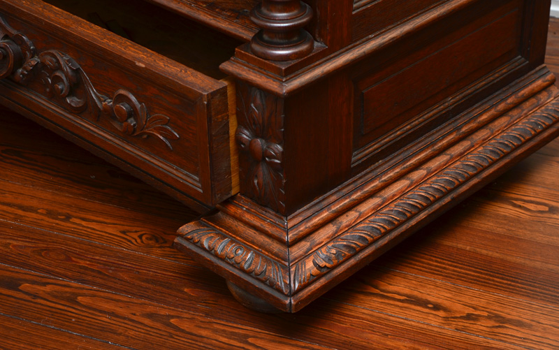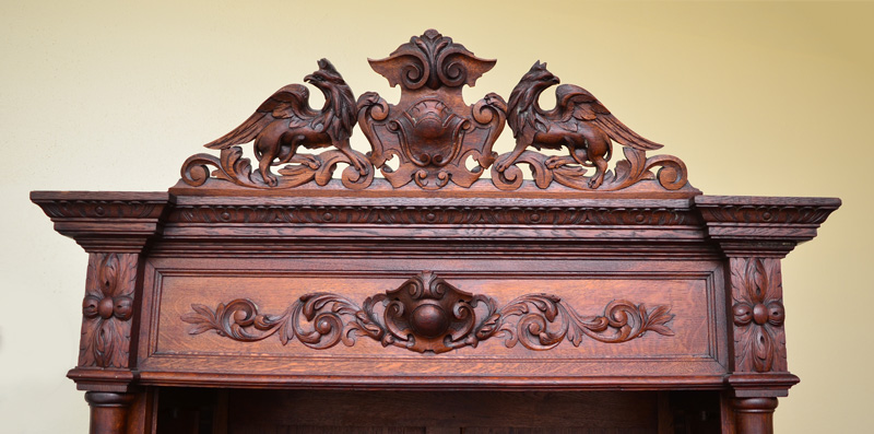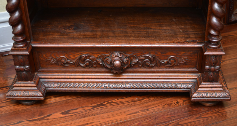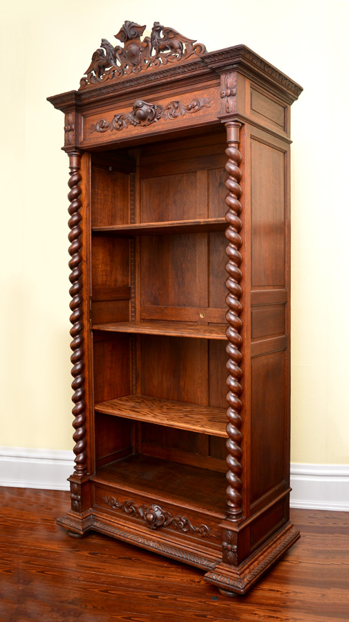 VICTORIAN OAK CARVED BOOKCASE: Carved crest with figural winged griffin, pediment with applied foliate scroll, barley twist column stiles, applied decoration on drawer at base. 3 inset adjustable wood shelves 15''deep. Overall measures 98'' h. x 44'' x 23''.