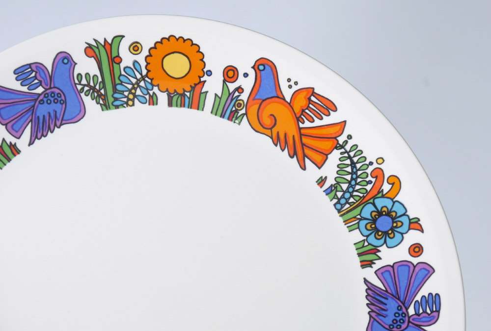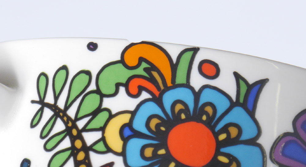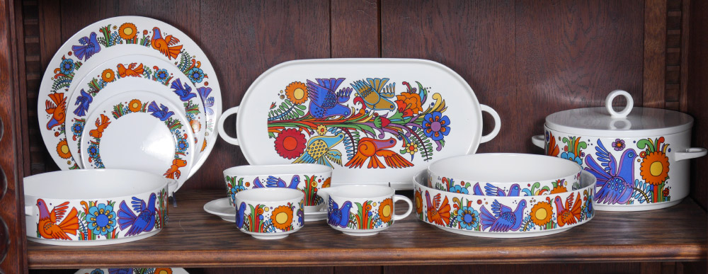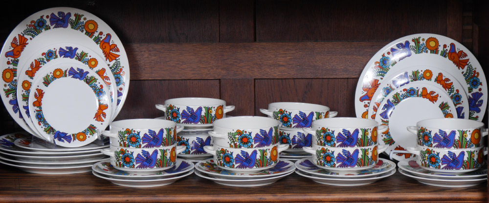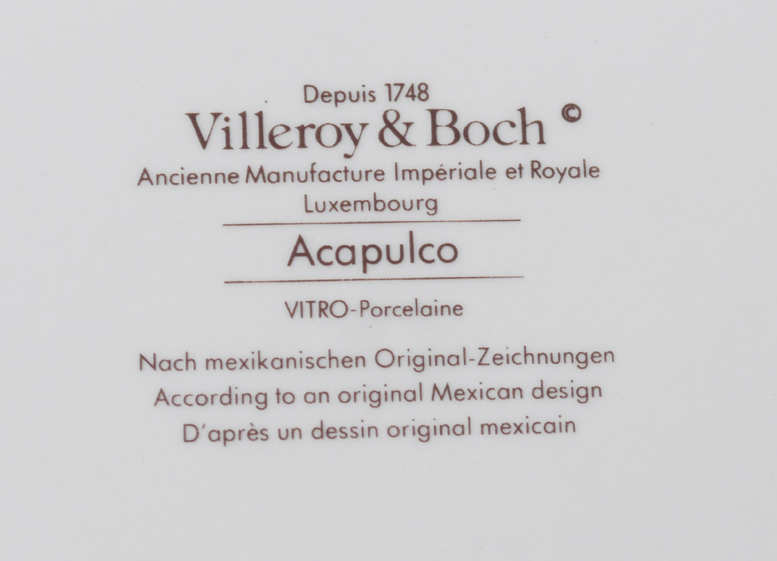 VILLEROY & BOCH ''ACAPULCO'' CHINA: Approx. 77 pieces to include 13 dinner plates (10''), 9 salad plates, 8 bread plates, 12 cream soup with 12 saucers, 8 flat bottom cups, 7 saucers, covered casserole, 3 open vegetable, gravy boat, creamer, sugar, and the platter (16'' including the handles).