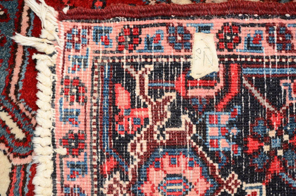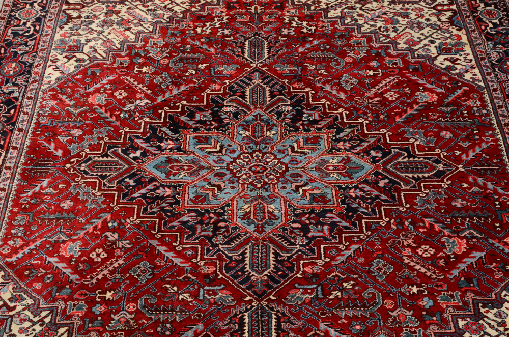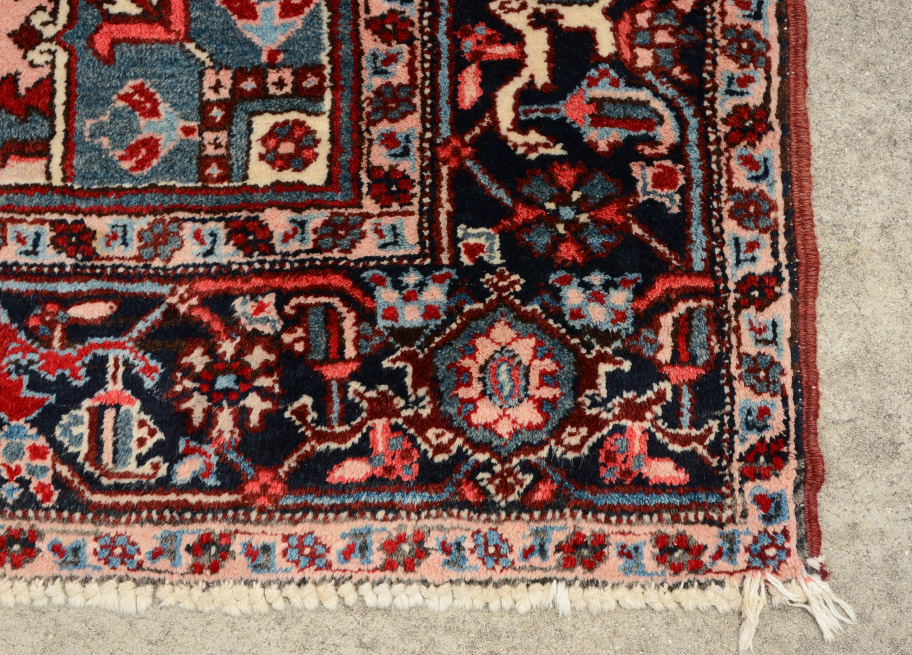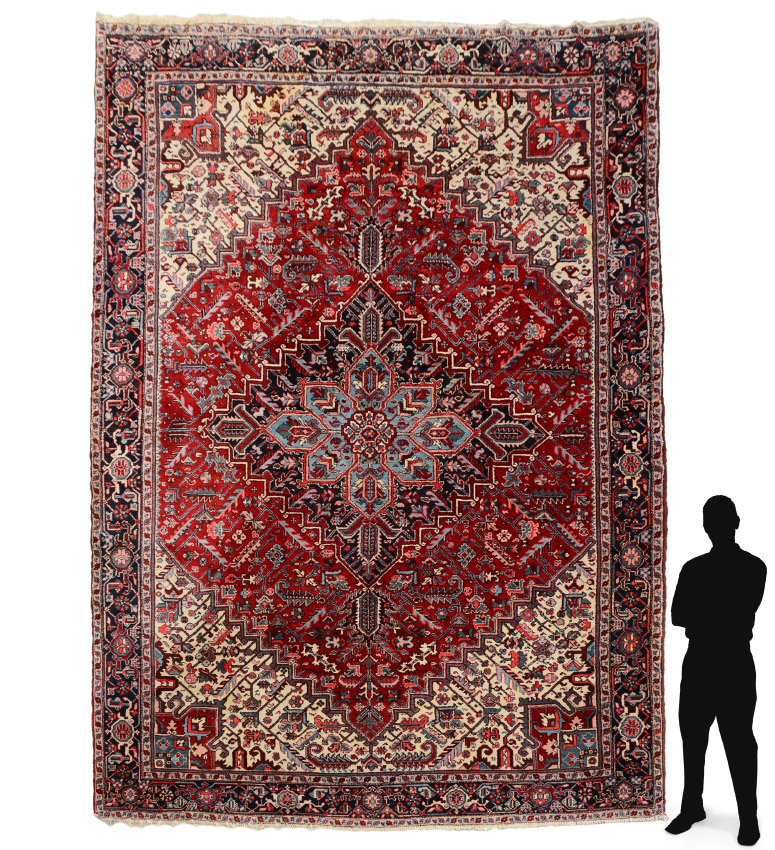 SEMI-ANTIQUE PERSIAN HERIZ HAND KNOTTED WOOL RUG, 10' x 14'8'': This rug has a traditional design including a large diamond shaped medallion done in two shades of blue that rests on a red field with white corners. The design motifs that cover the field include large leaves and various flowers done in shades of blue, red, pink, white and black. The main border has a deep blue ground that completes the rugs look.