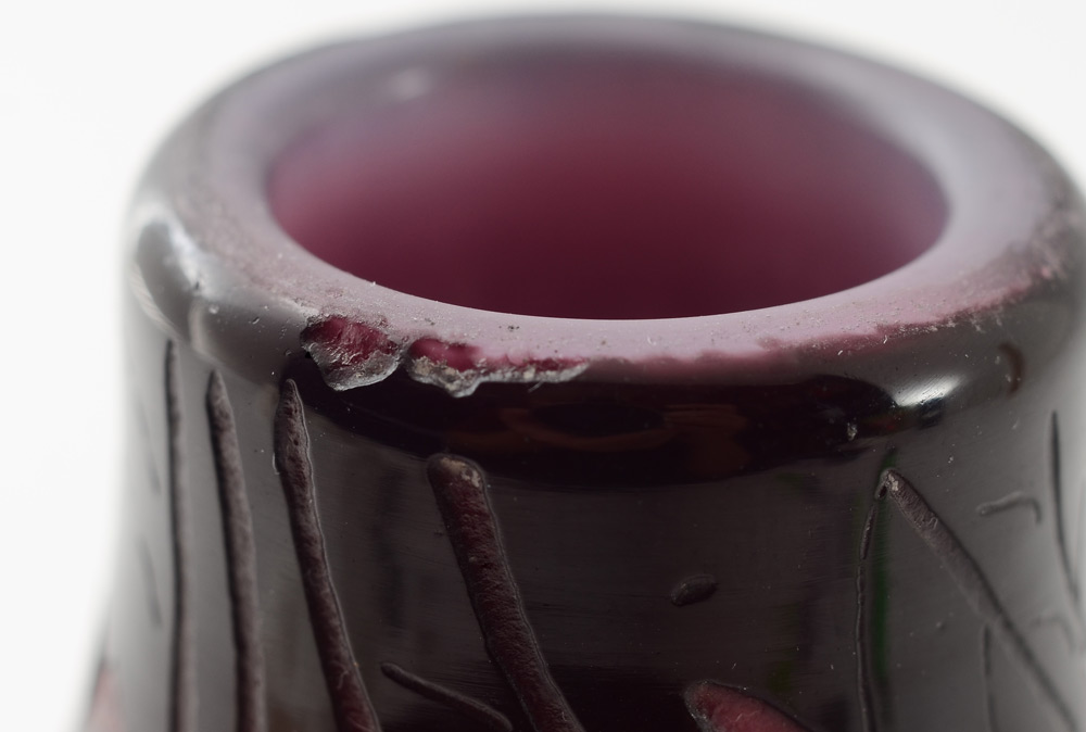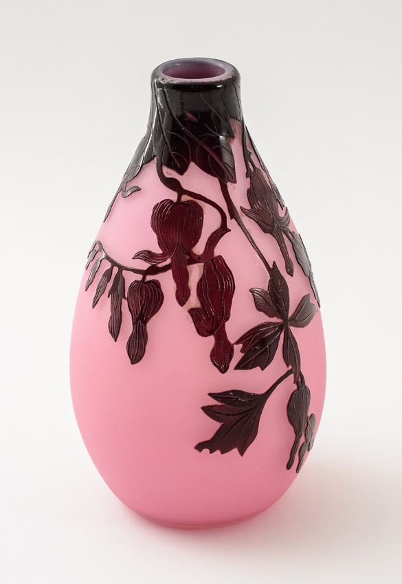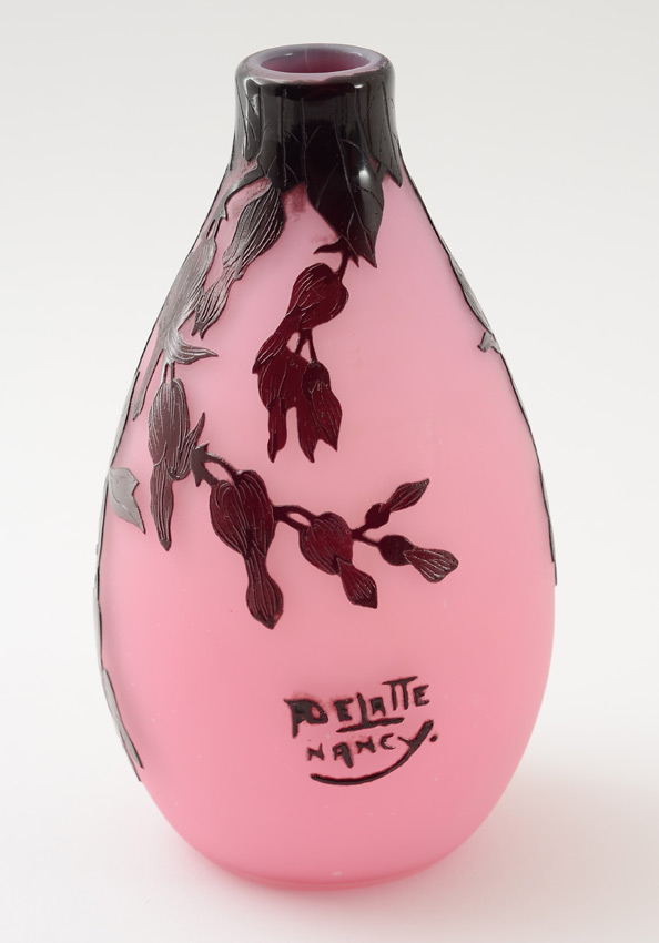 ANDRE DELATTE NANCY CAMEO GLASS VASE: Ovoid form, pink ground with purple floral cameo decoration. Signed A Delatte Nancy, 6'' h. x 3 1/4'' dia.