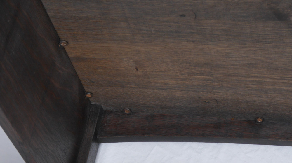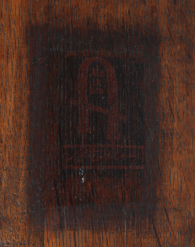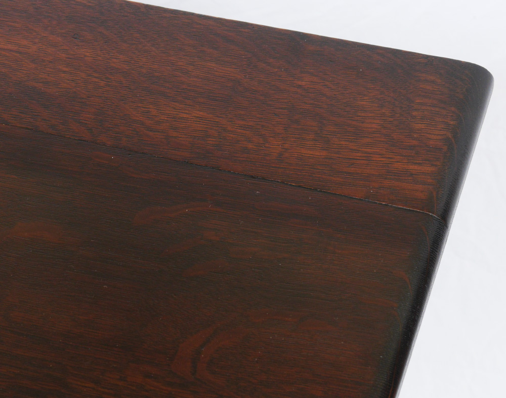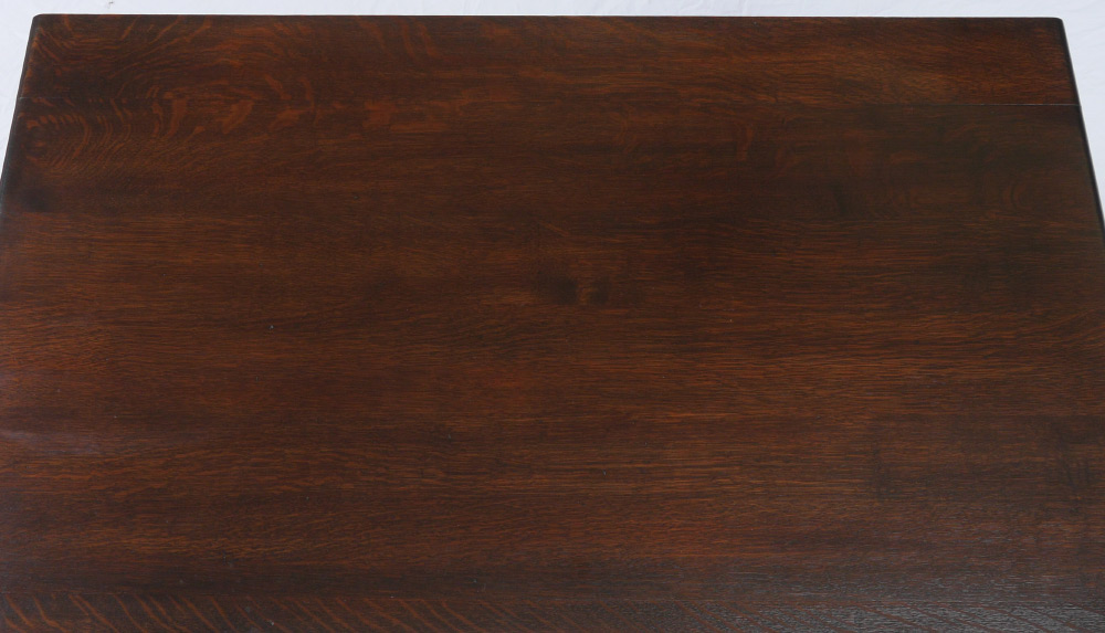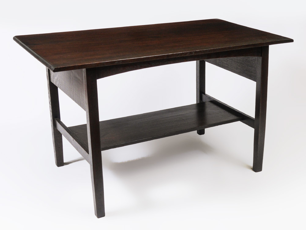 GUSTAV STICKLEY ARTS & CRAFTS LIBRARY TABLE: Rare library table designed by Harvey Ellis for Gustav Stickley, circa 1903. Ellis only worked for Stickley for 8 months before passing away in 1904. Rectangular top, shaped side aprons, extended end aprons over open lower shelf, tapered legs. Early label under shelf. Overall measures 30'' h. x 50'' x 30''