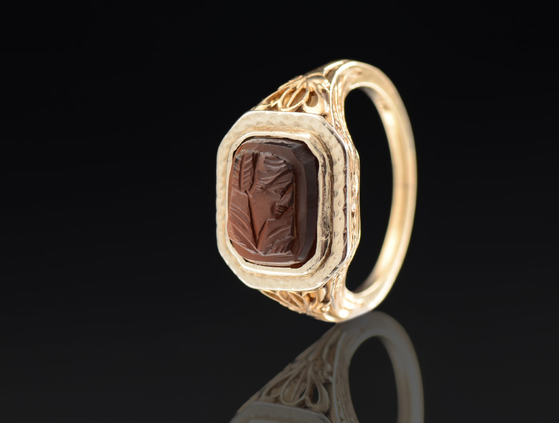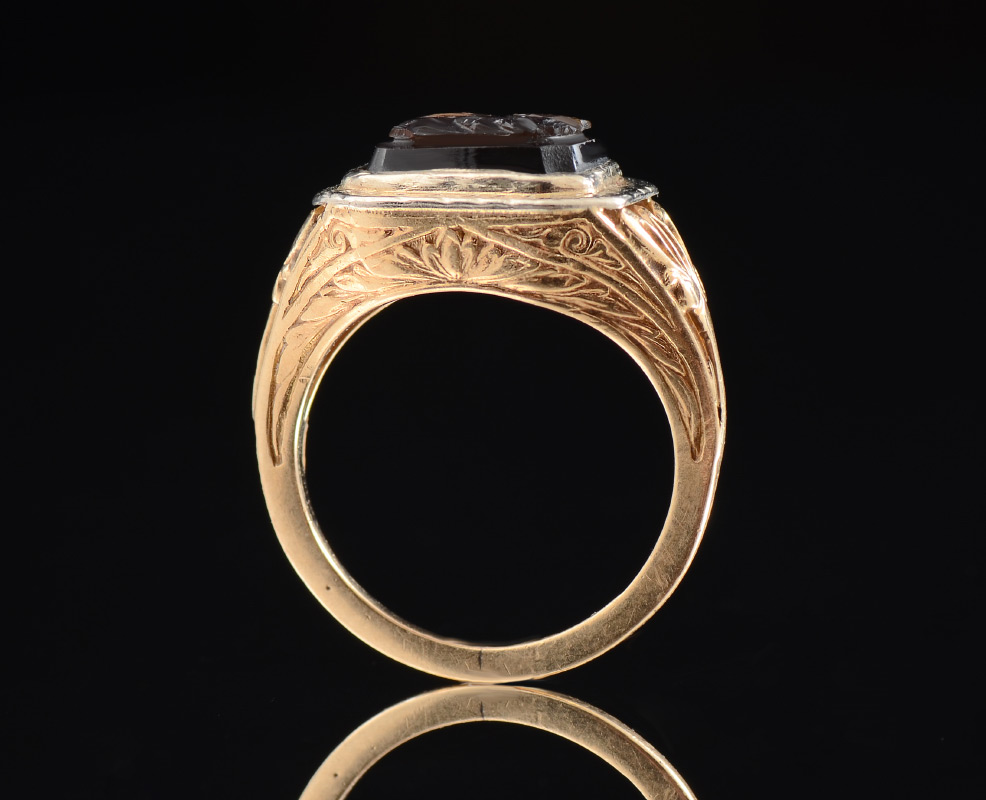 19th C VICTORIAN INTAGLIO RING: Profusely chased 14K yellow gold ring centering a carved sardonyx tablet. Size 4.5. Weight 3.7 grams.