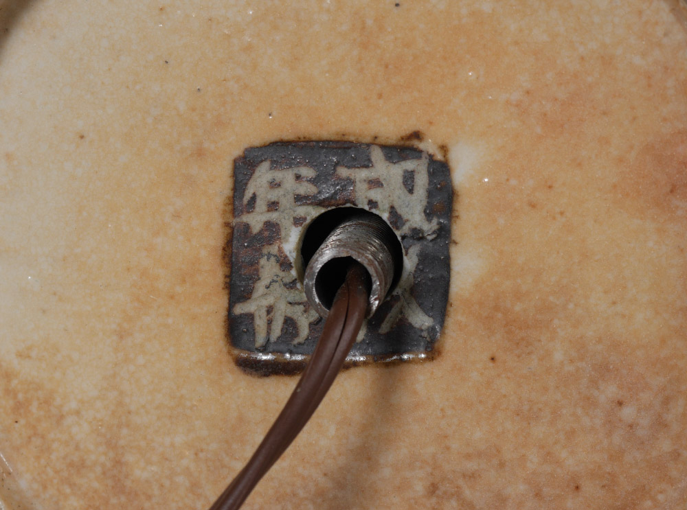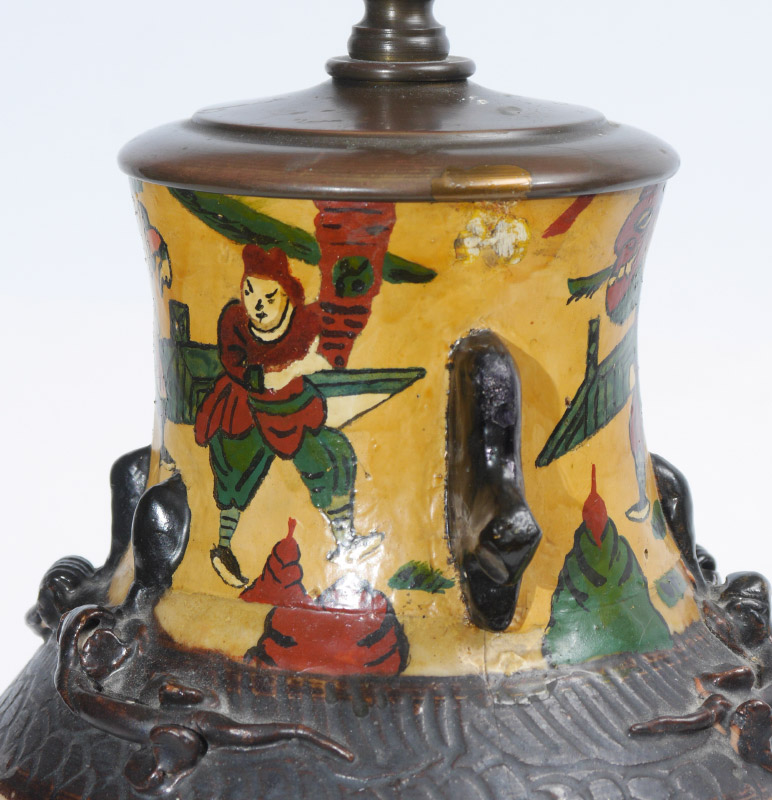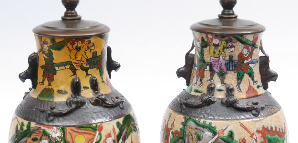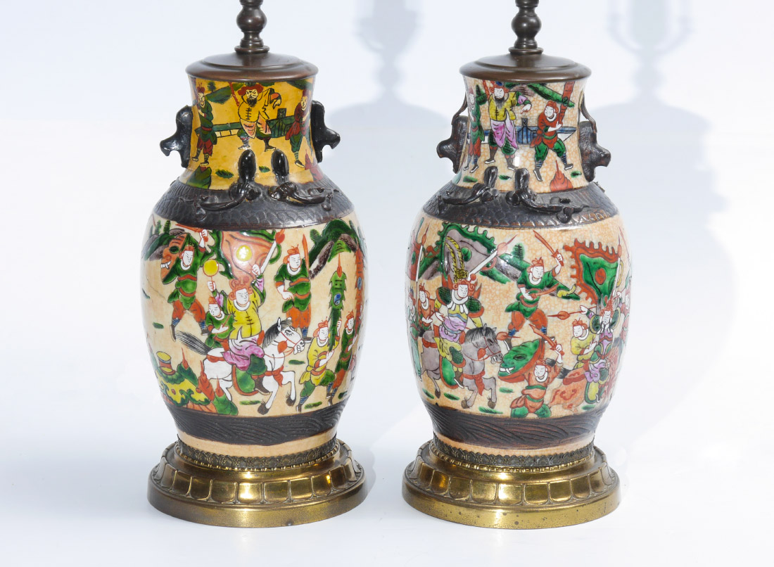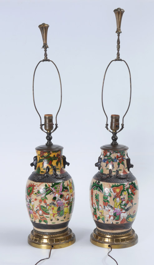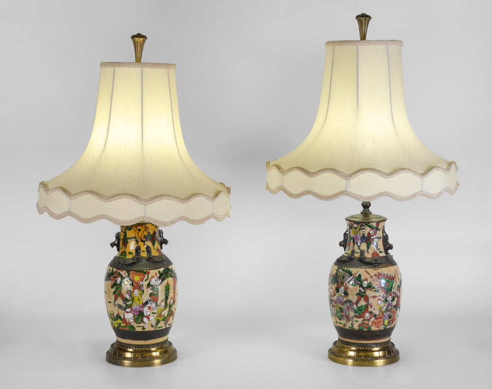 PAIR ORIENTAL POTTERY LAMPS: Bodies with polychrome incised battle motifs, applied figural handles and decoration at shoulder. Gilt metal base, single socket fixture, marked in characters on base, 18 1/2'' h. x 9'' dia. Sold with cloth shades, 14 1/2'' h. x 18'' dia.
