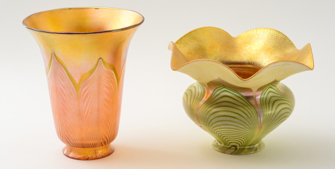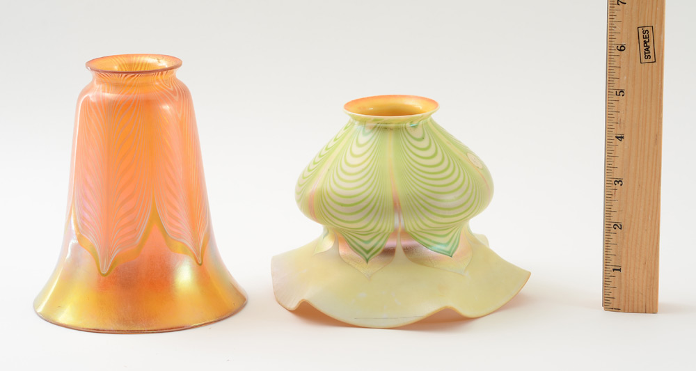 2 IRIDESCENT ART GLASS PULLED FEATHER SHADES: 2 shades total to include 1) Ruffled rim, green and opal pulled feather, iridescent gold interior. 4 1/2'' h. x 6 3/4'', 2 1/4'' fitter rim. 2) Signed Quezal, iridescent gold with flared rim, pulled feather, 5 1/2'' h. x 4 7/8'', 2 1/4'' fitter rim.