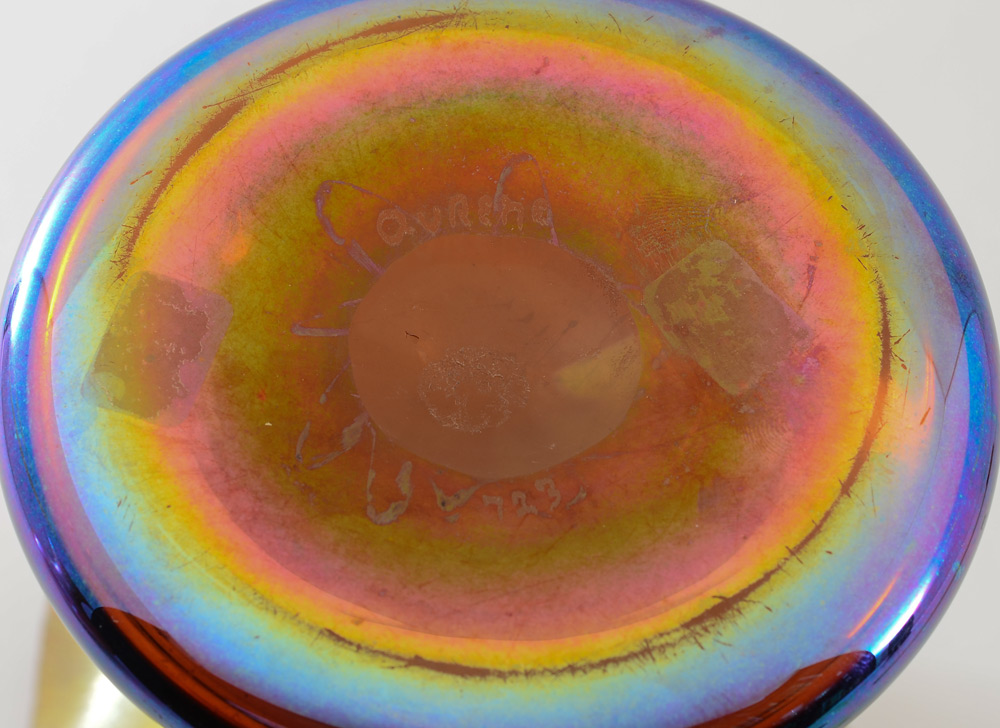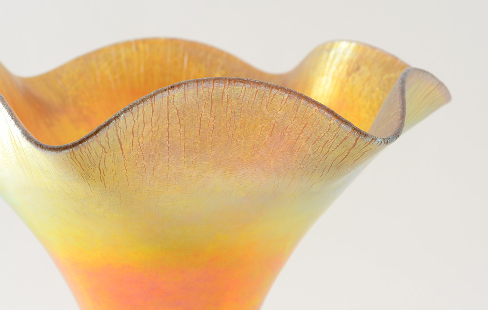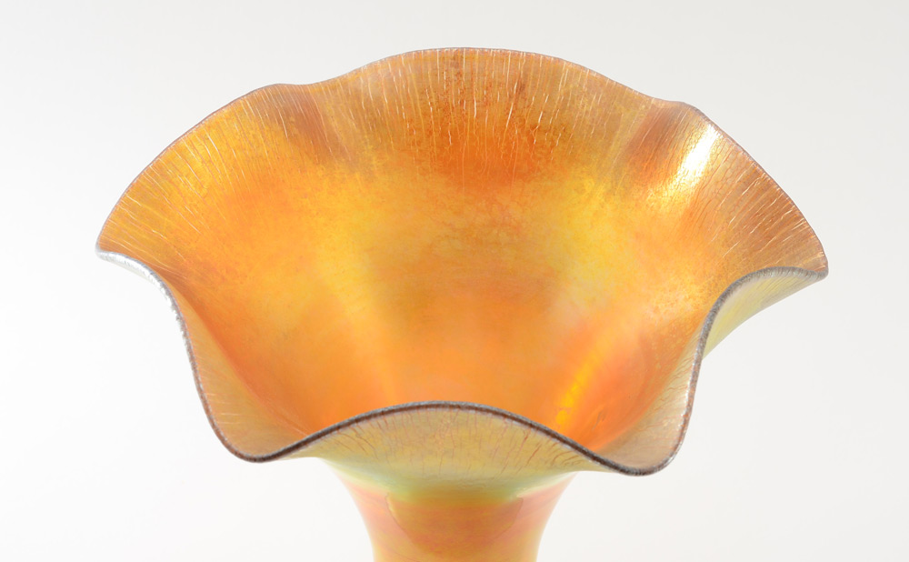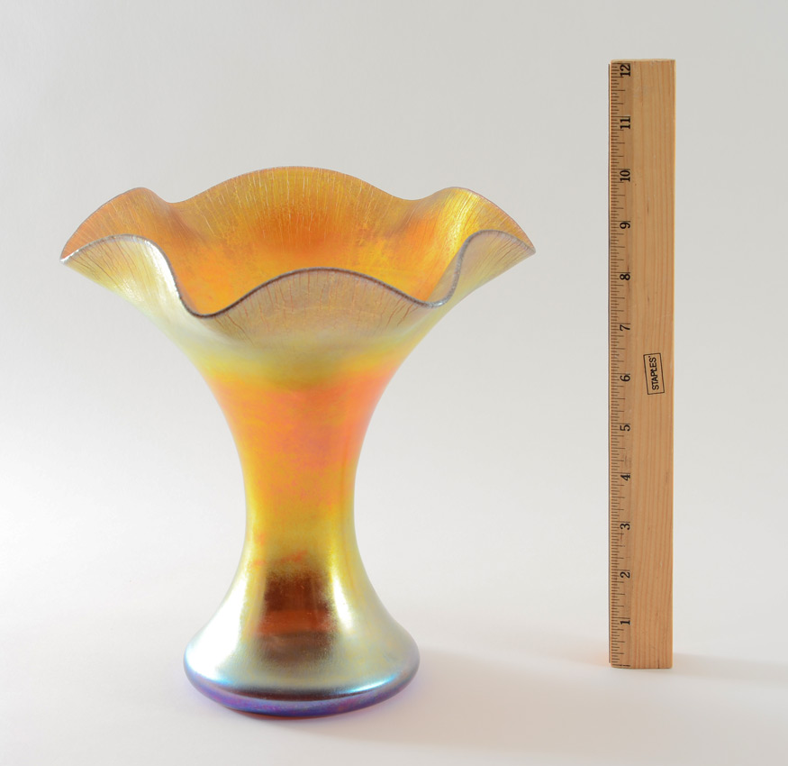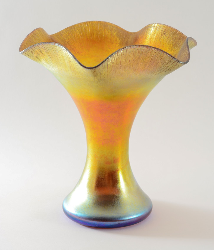 STEUBEN GOLD AURENE RUFFLED VASE 723: Flared ruffled rim, signed on base Aurene, 723. 9 3/4'' h. x 9''.