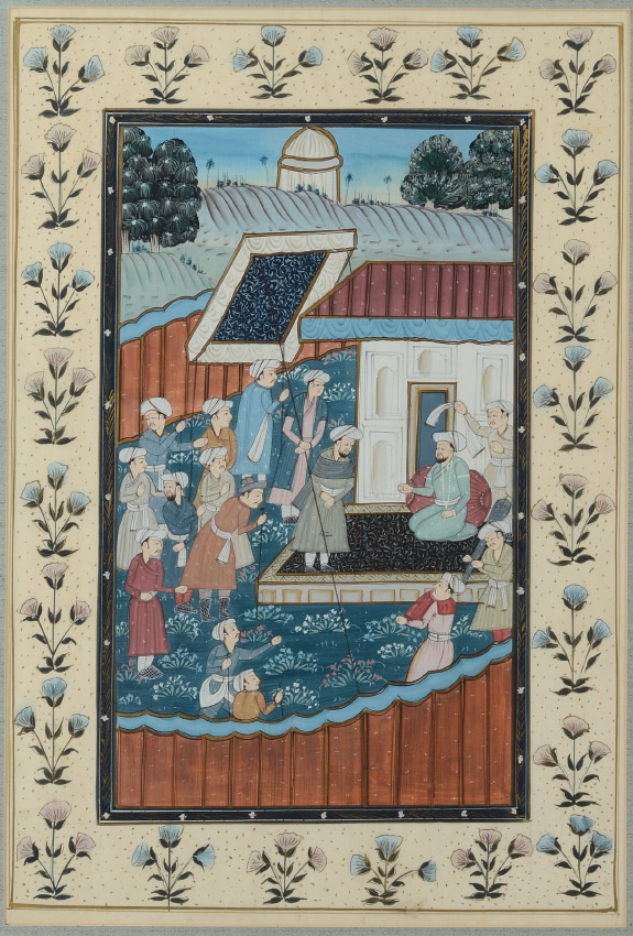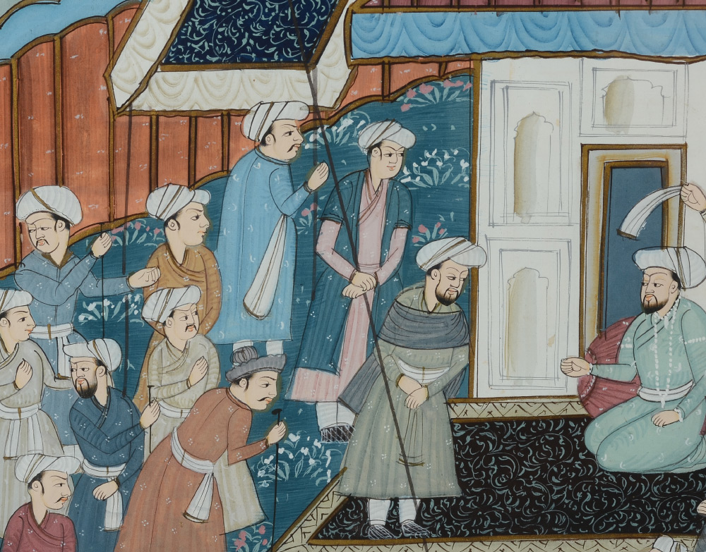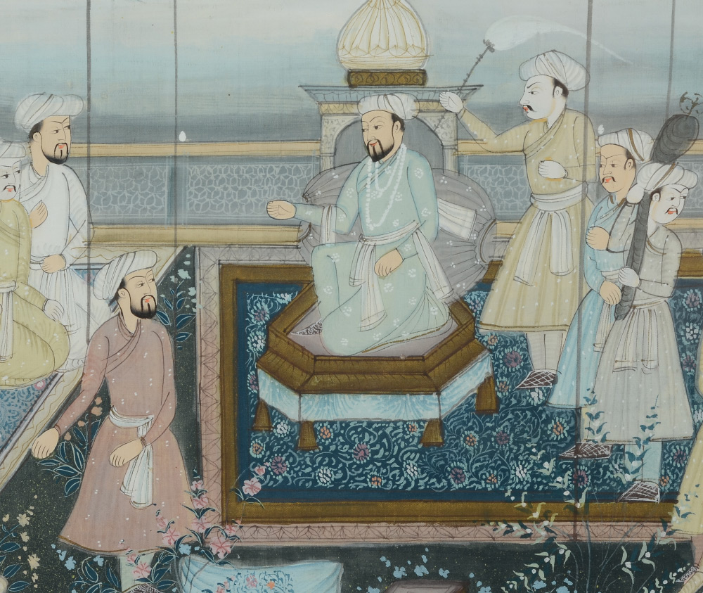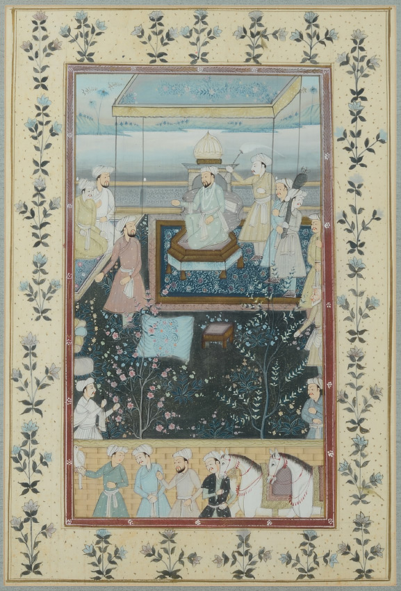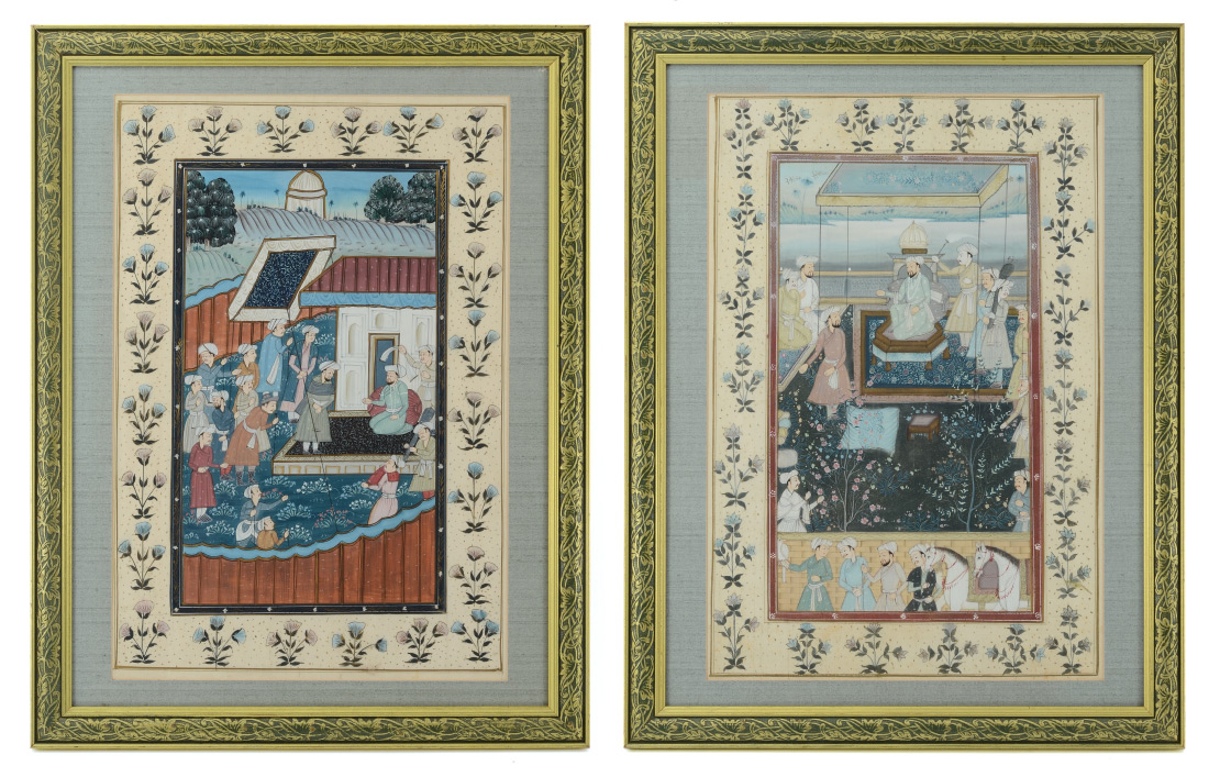 PAIR OF PERSIAN PAINTINGS ON FABRIC OF ROYALTY: sight size 21 1/2'' x 14 1/2'', framed, 26 1/2'' x 20 1/2'', age unknown.