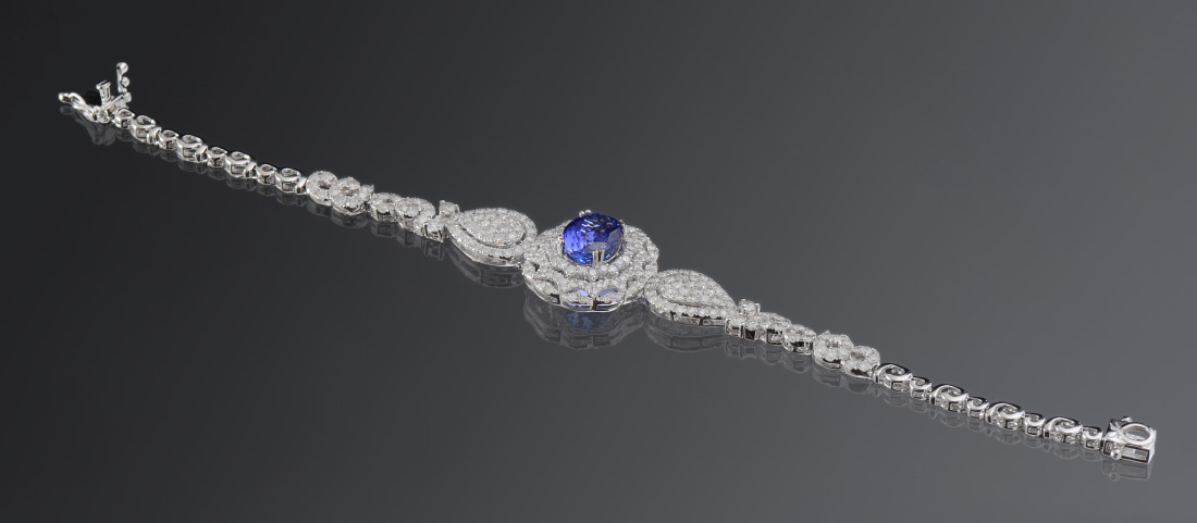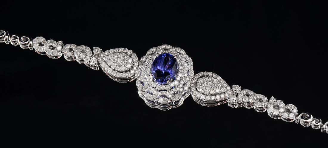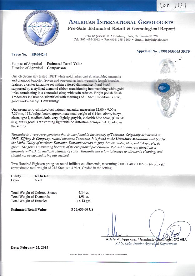 A DAZZLING 18K TANZANITE AND DIAMOND BRACELET: Featuring a 6.14 Ct oval mixed cut tanzanite set in a three tier diamond bezel supported by a diamond ribbon transitioning into links. The 218 round brilliant cut diamonds total approx. 4.91 Ct, rated I1-I3 clarity and G-I color. Length 7.5''. Weight 16.22 grams. Sold with current AIG GIA graduate's appraisal for $26,630.