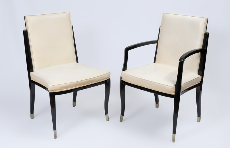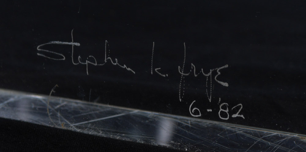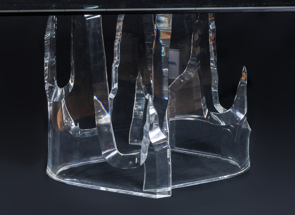 HIGH STYLE ACRYLIC ''ICEBERG'' BASE DINING TABLE: Acrylic base designed by Stephen K. Frye and dated 6-82. Each section 28 1/2'' h. x 24 1/4'' x 24''. Double beveled glass top, 72'' x 42''. Sold with 6 black lacquer frame chairs with white leather upholstery, metal accents, the 2 arm chairs (36'' x 23 1/2'' x 22 1/2''). Stephen K. Frost holds a patent design for acrylic table bases for Lion in Frost, a company based in Ft. Lauderdale FL. in the late seventies, early eighties.